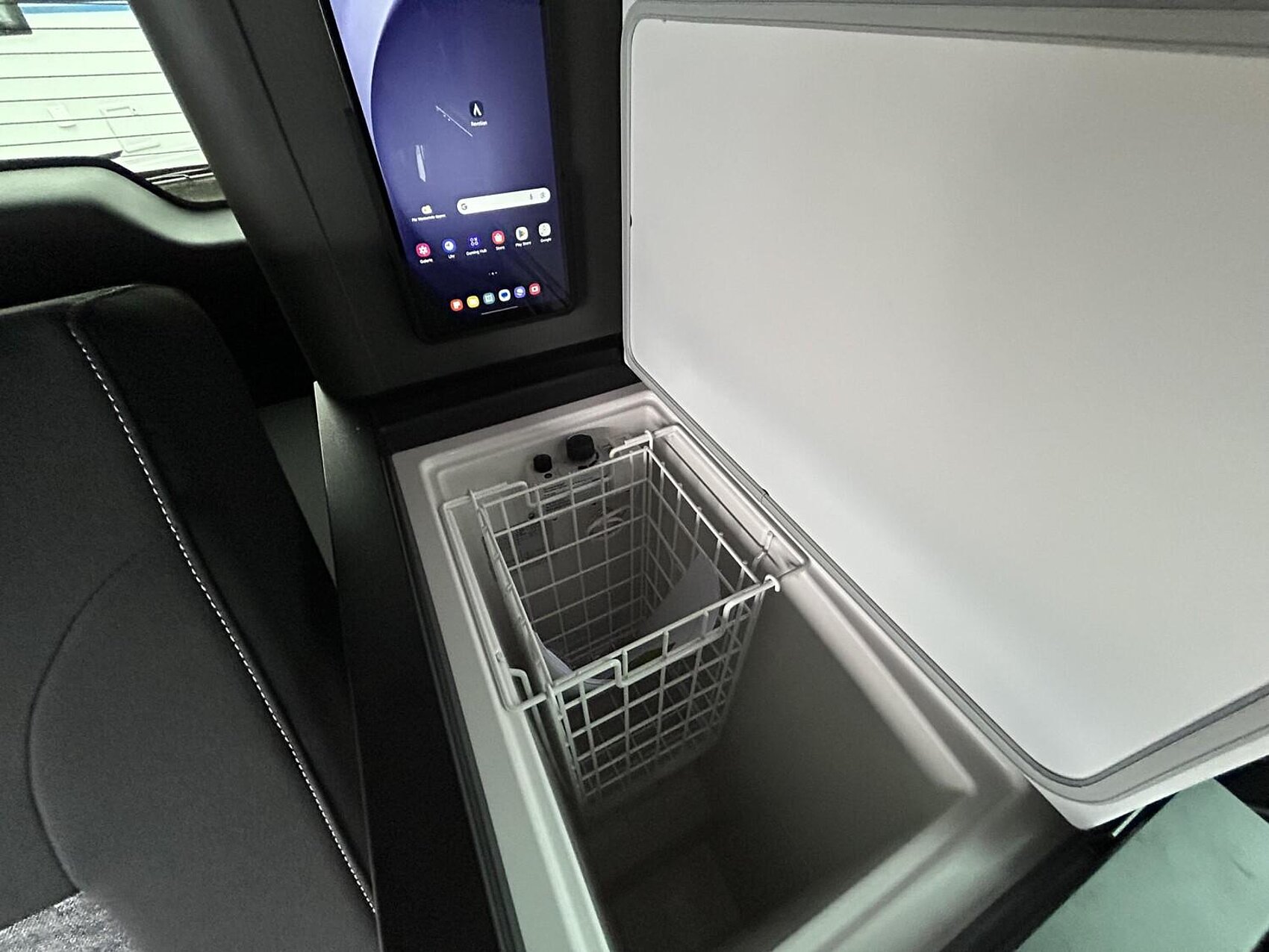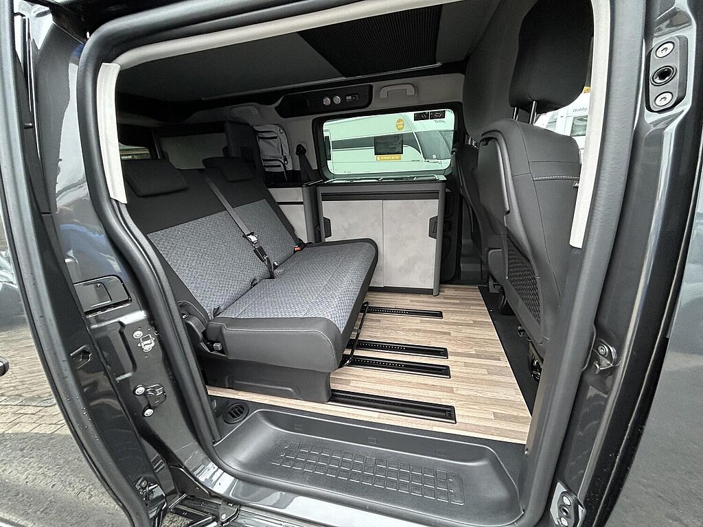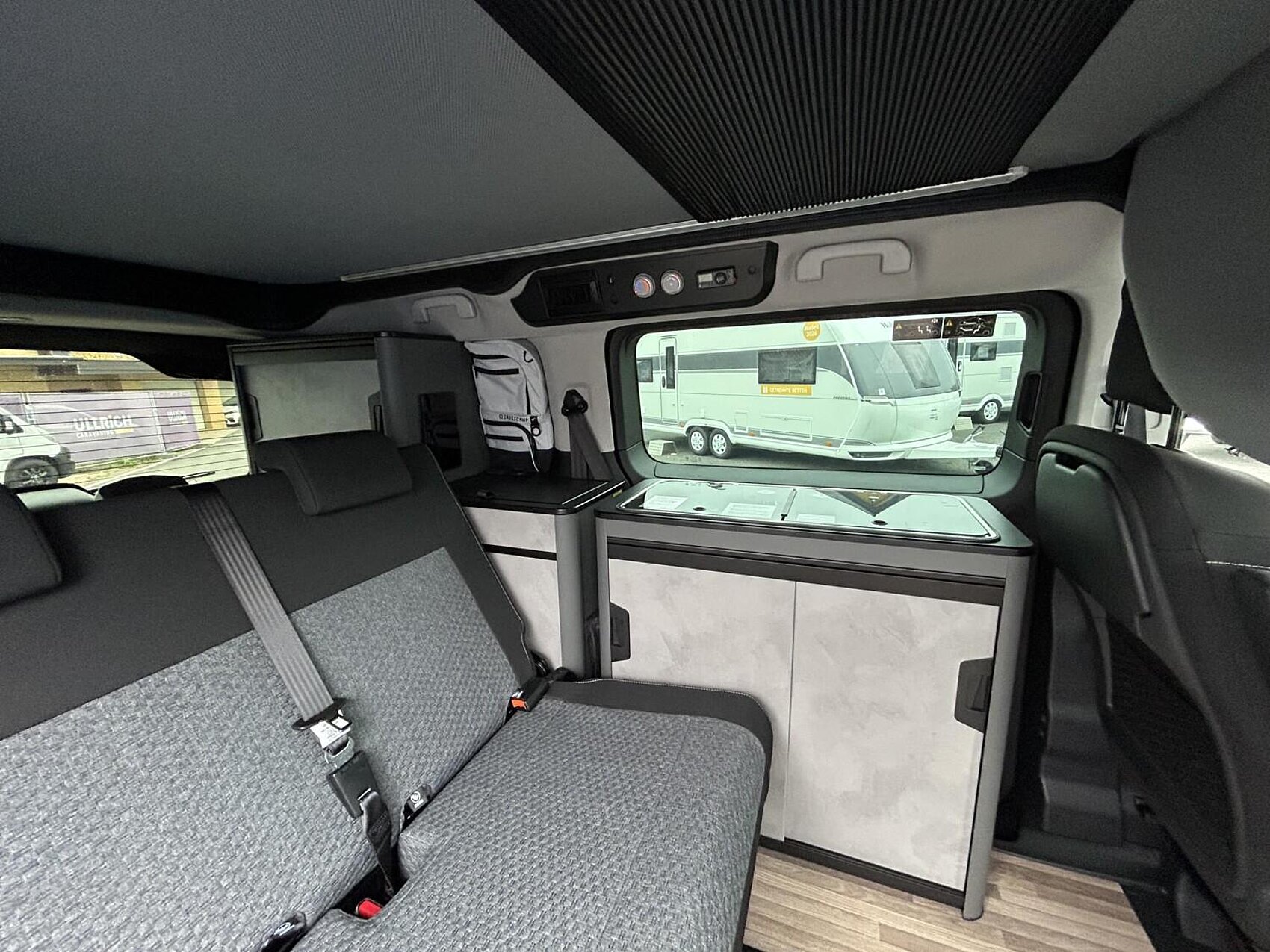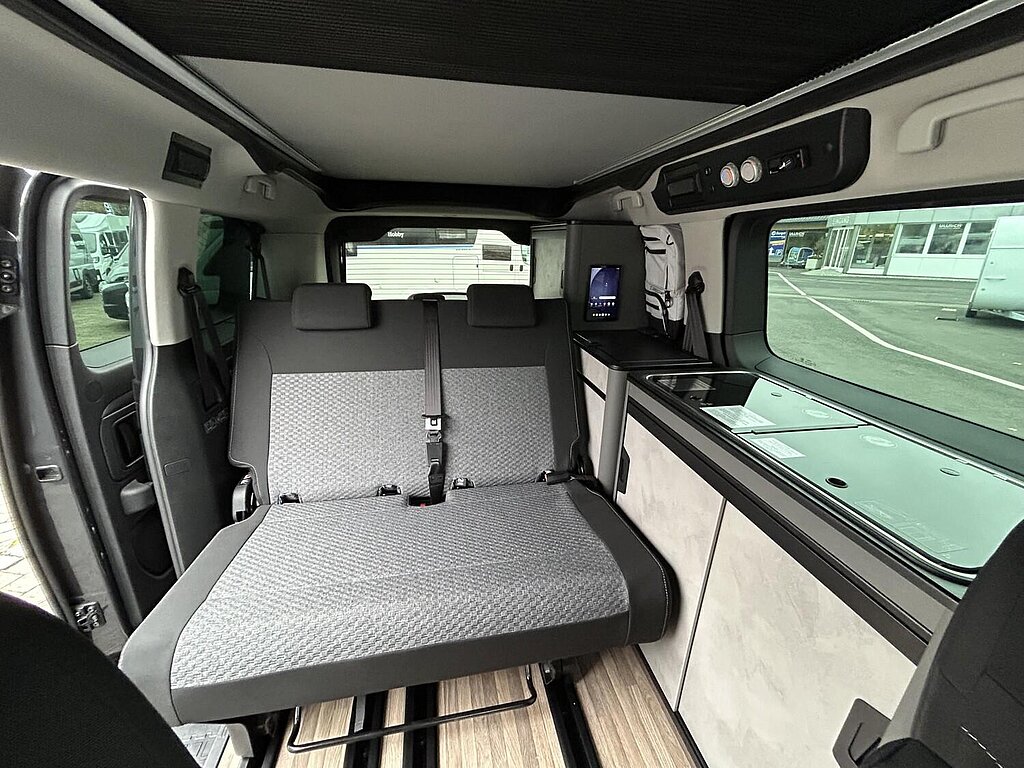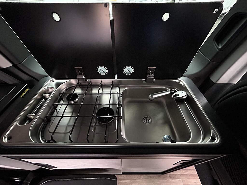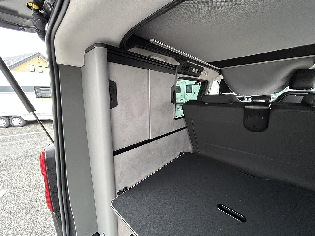 - Camp Kit (Zusätzliche Digital-Steuerungsfunktionen inkl. Tablet (Steuerung von Ambientelicht, Standheizung und Batteriemanagement, Tankfüllstandsanzeigen), Standheizung inklusive Anbindung an Revotion (Smartphone) und Wandbedienpanel (Heizbedienpanel bleibt wegen Temperatursensor), Multifunktions-Campingtisch (in Küchenblock einhängbar, ebenso autark nutzbar), Flexboard, entnehmbar, Zwei Schwanenhalsleuchten im Aufstelldach mit USB-C Anschluss, Beleuchtete Heckklappe (Spot), Dimmbare Ambientbeleuchtung in Möbelbau, Kompressorkühlbox 36l fest verbaut in Heckschrank, Dachreling rechts und links, Außendusche (Schlauch, Brausekopf, Halter und Saugnapf))