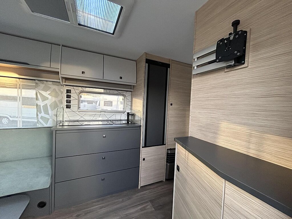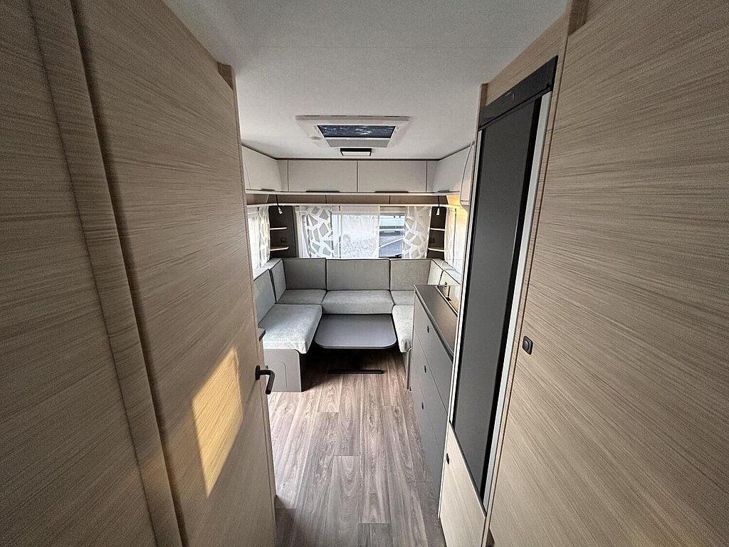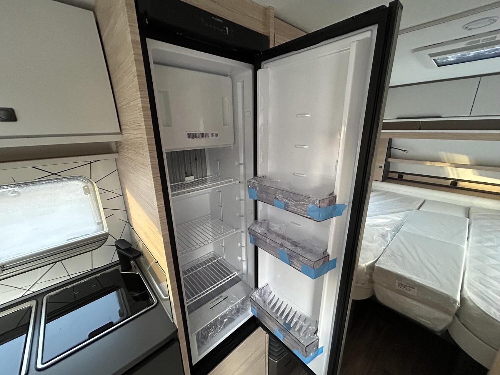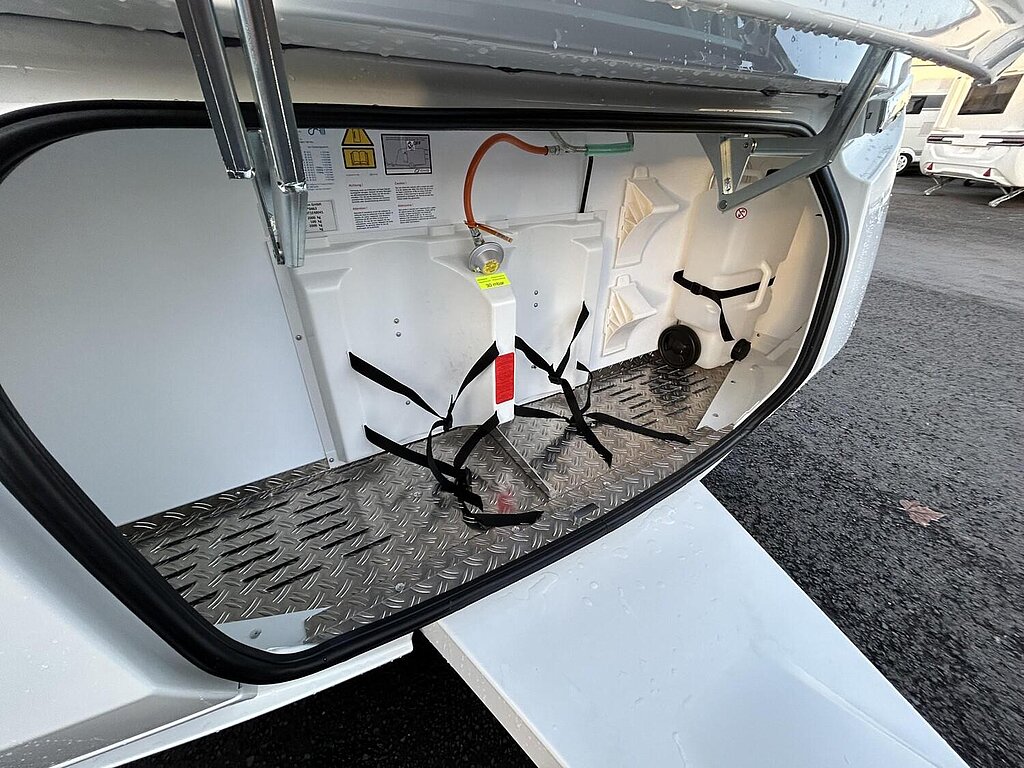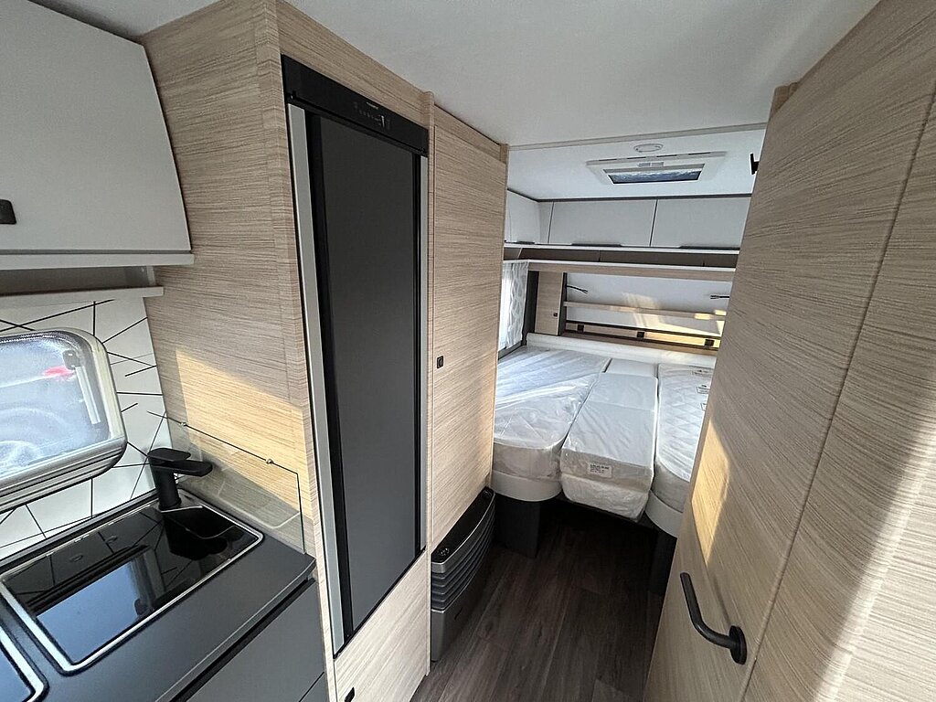Eingangstür mit integriertem und isoliertem Einstieg, Abfallsammler und Ablage, im oberen Eingangstürbereich getöntes Fenster und Verdunkelungsplissee