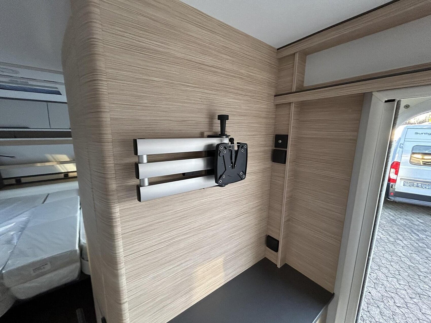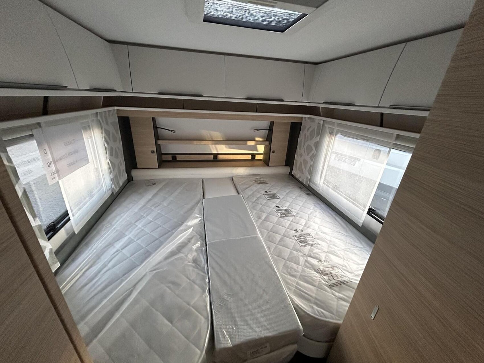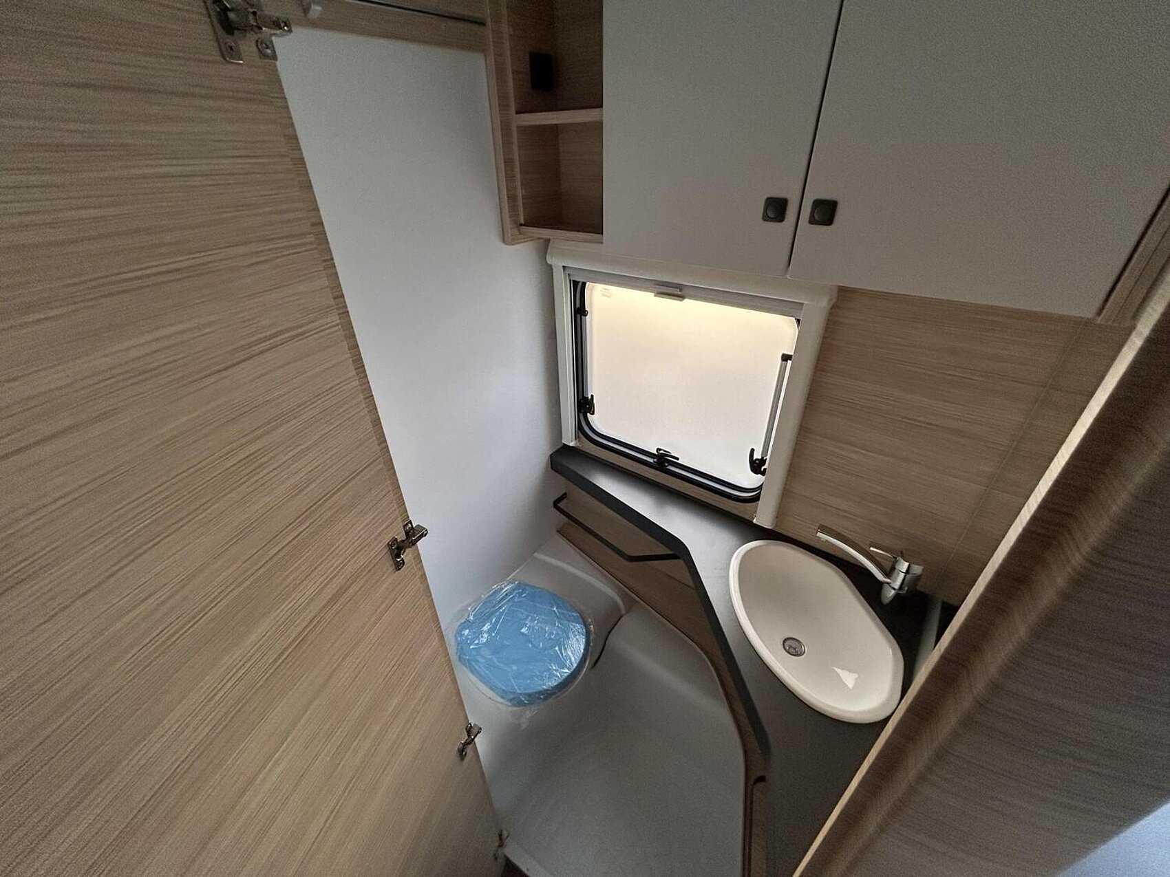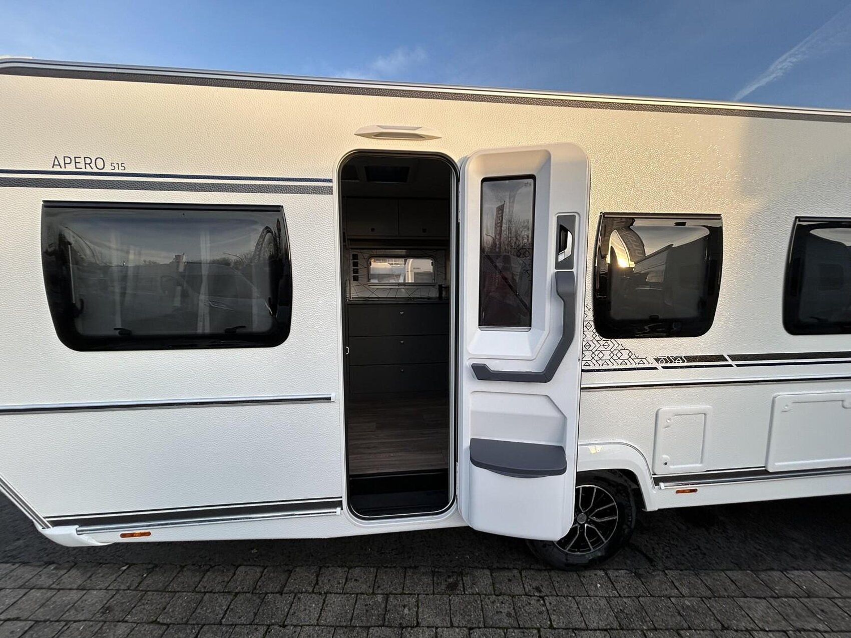 Eingangstür mit integriertem und isoliertem Einstieg, Abfallsammler und Ablage, im oberen Eingangstürbereich getöntes Fenster und Verdunkelungsplissee
