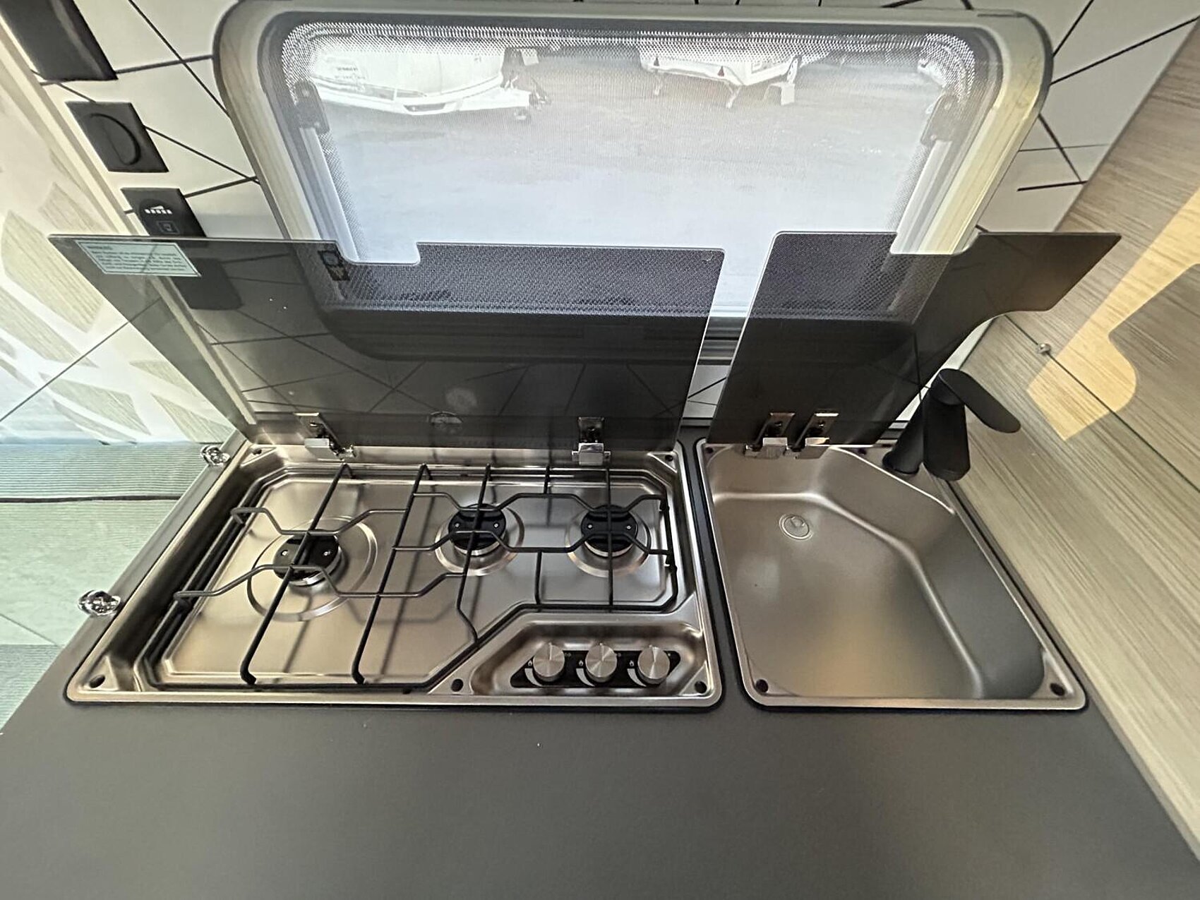 Kocher (3-flammig) mit Zündsicherung, Zündautomatik, matt emailliertem Kocherrost, Glasabdeckung und separater Spüle mit Glasabdeckung