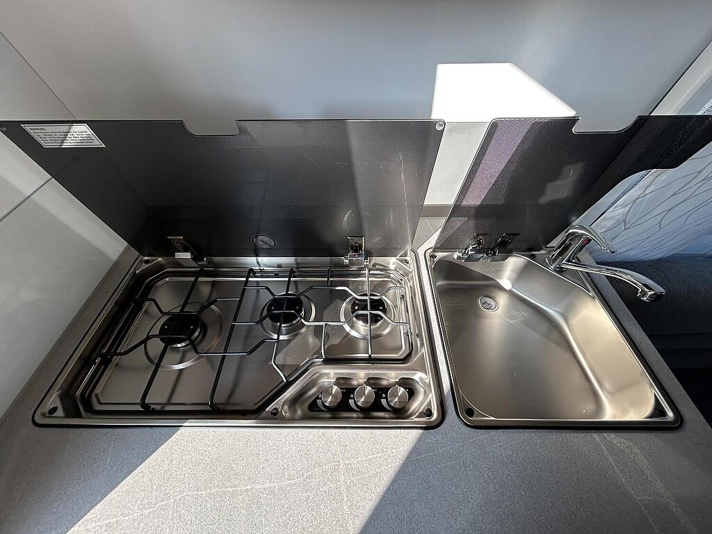 - Kocher (3-flammig) mit Zündsicherung, Zündautomatik, matt emailliertem Kocherrost, Glasabdeckung und separater Spüle mit Glasabdeckung