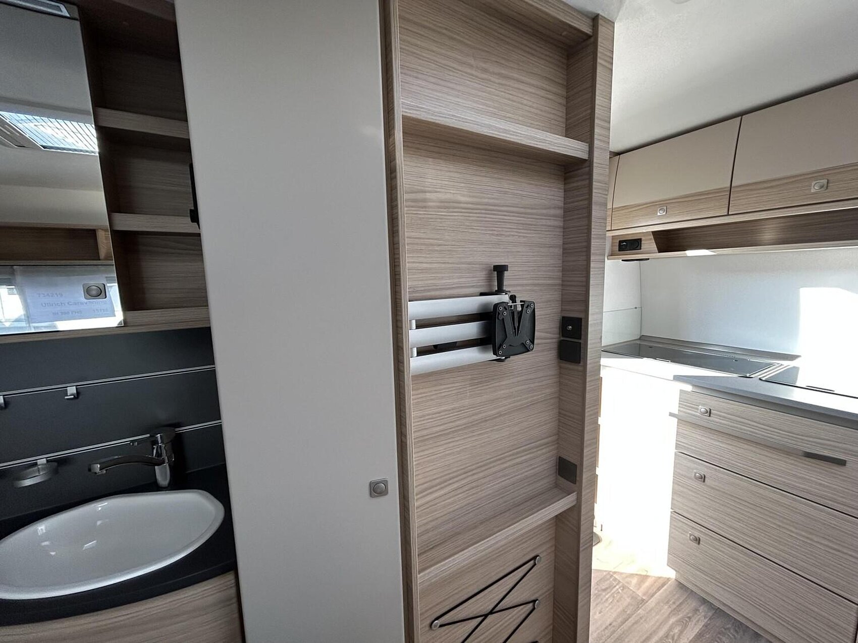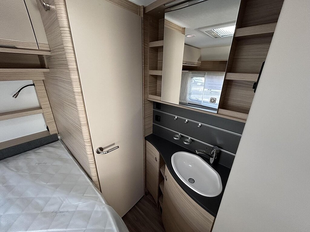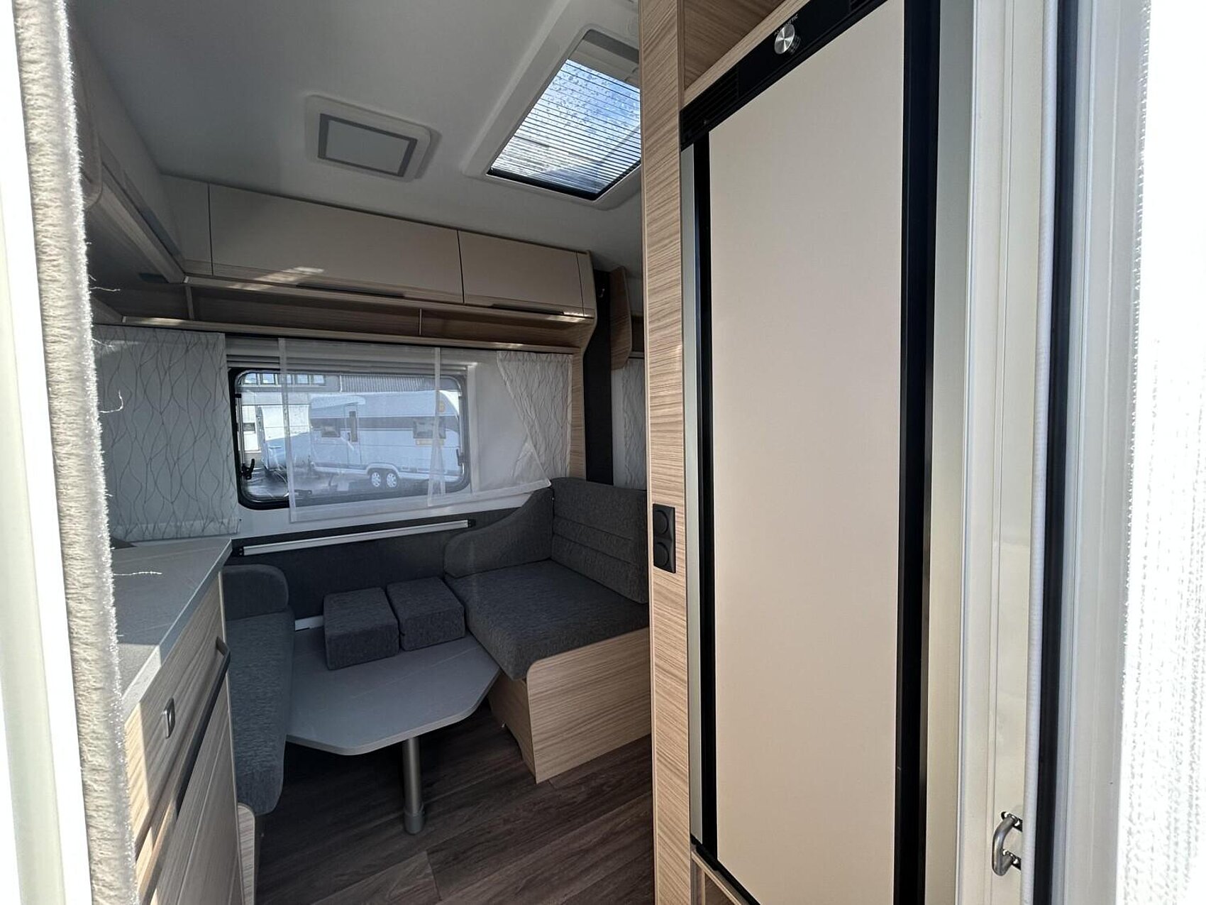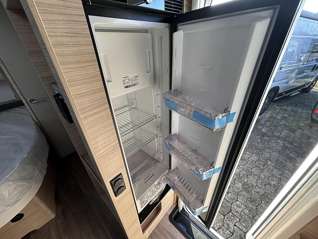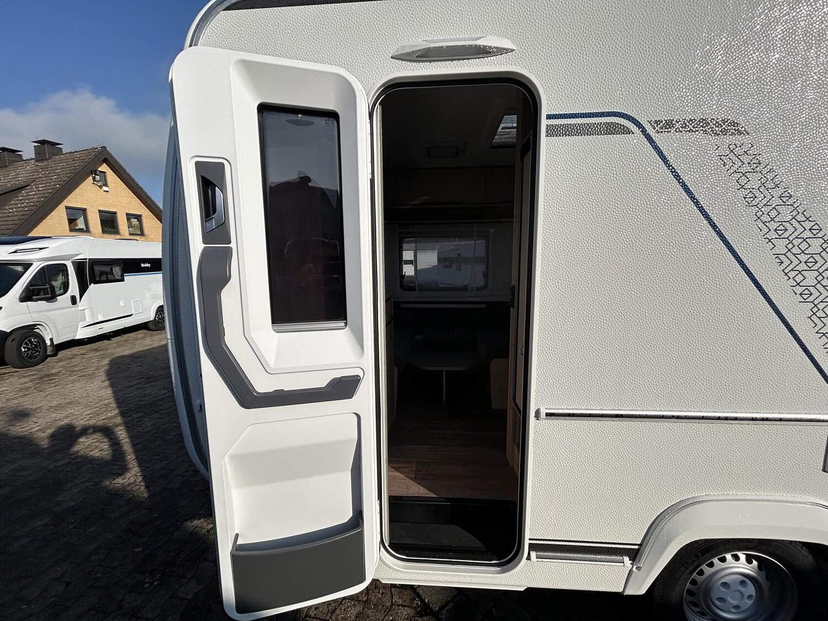 - Eingangstür mit integriertem und isoliertem Einstieg und Ablage im oberen Eingangstürbereich getöntes Fenster und Verdunkelungsplissee