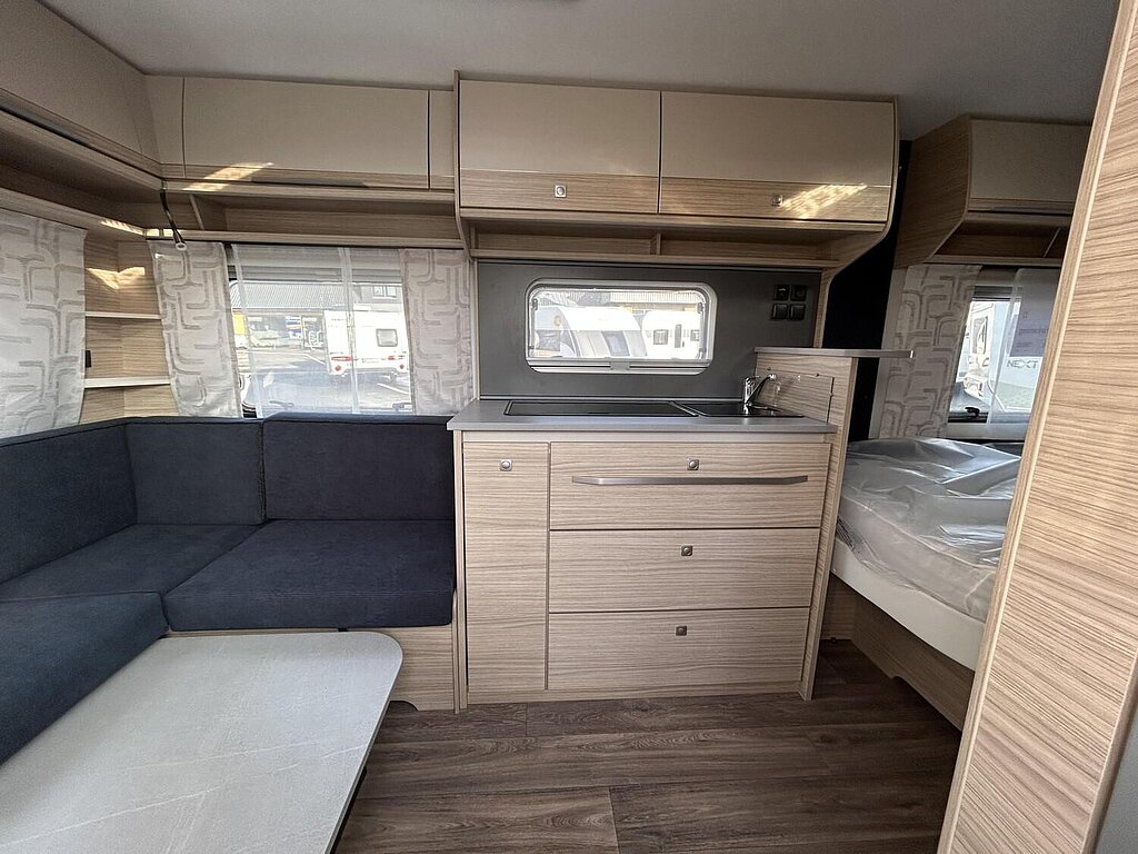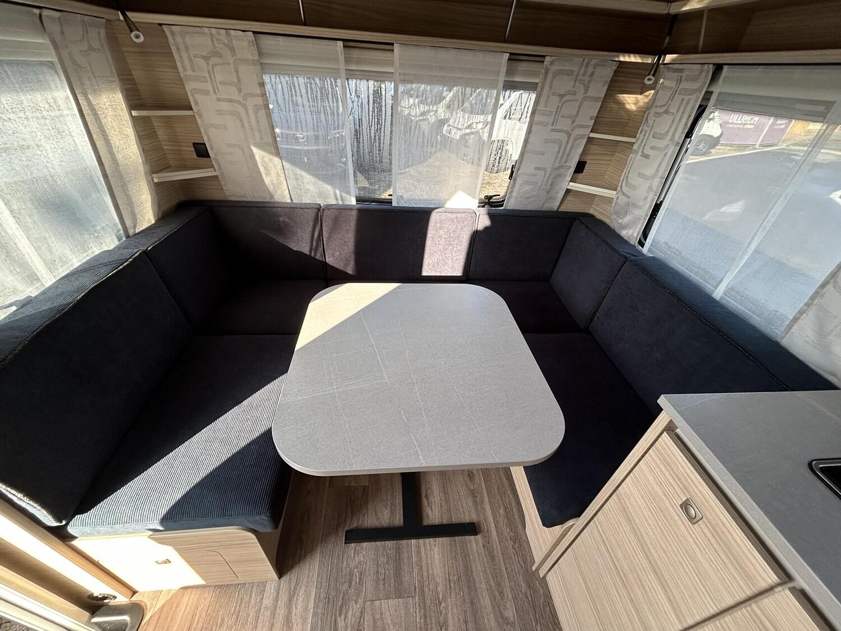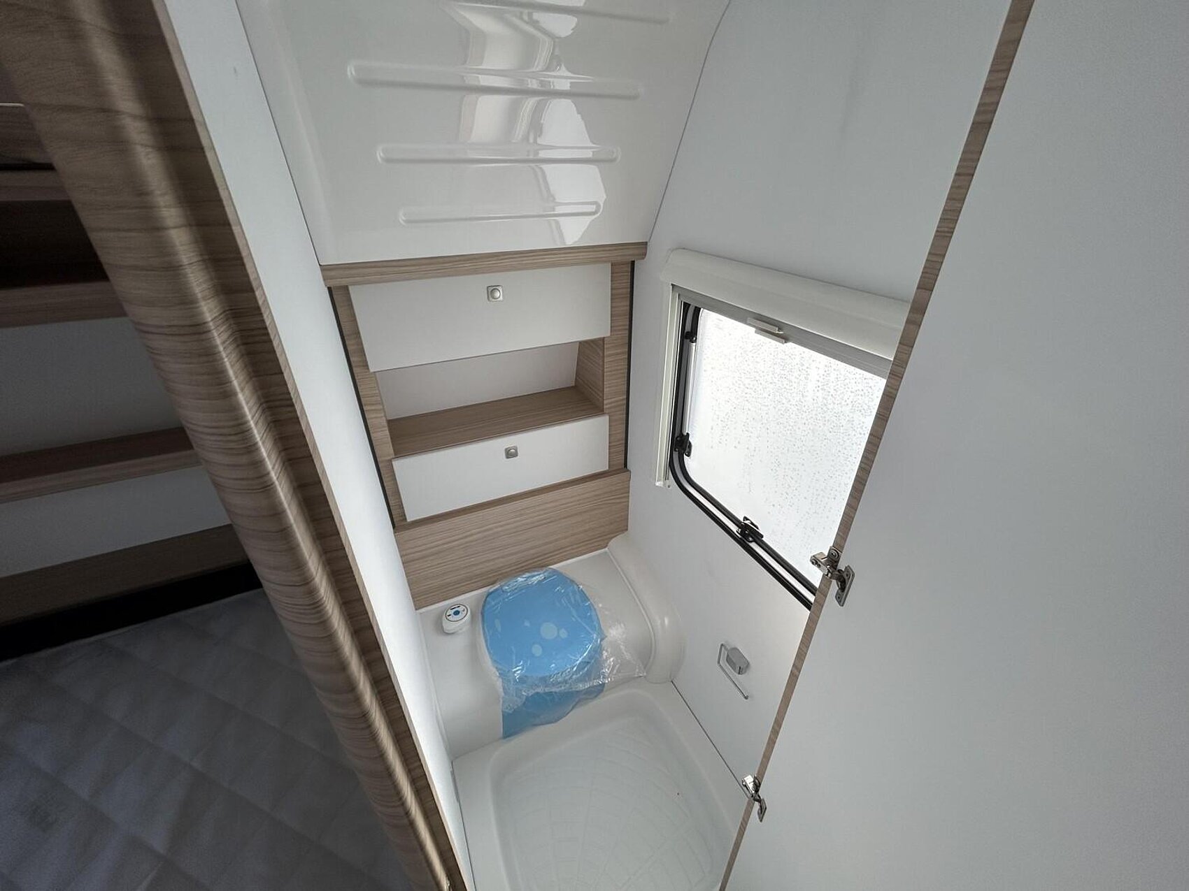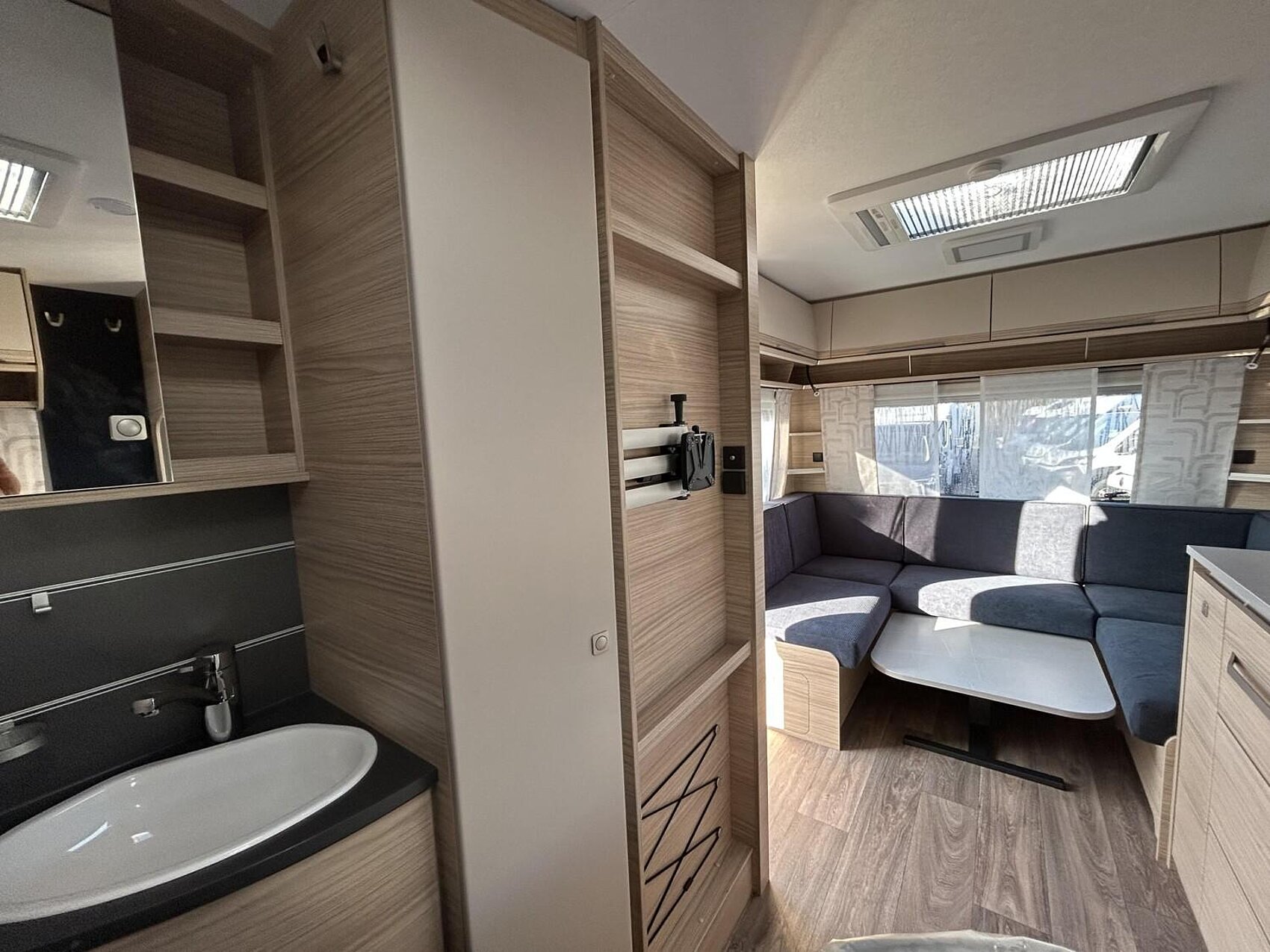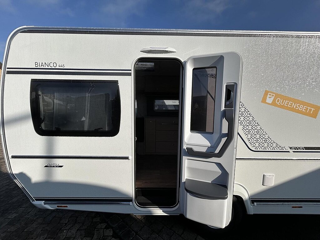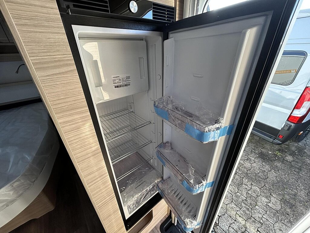 - Eingangstür mit integriertem und isoliertem Einstieg, Abfallsammler und Ablage, im oberen Eingangstürbereich getöntes Fenster und Verdunkelungsplissee