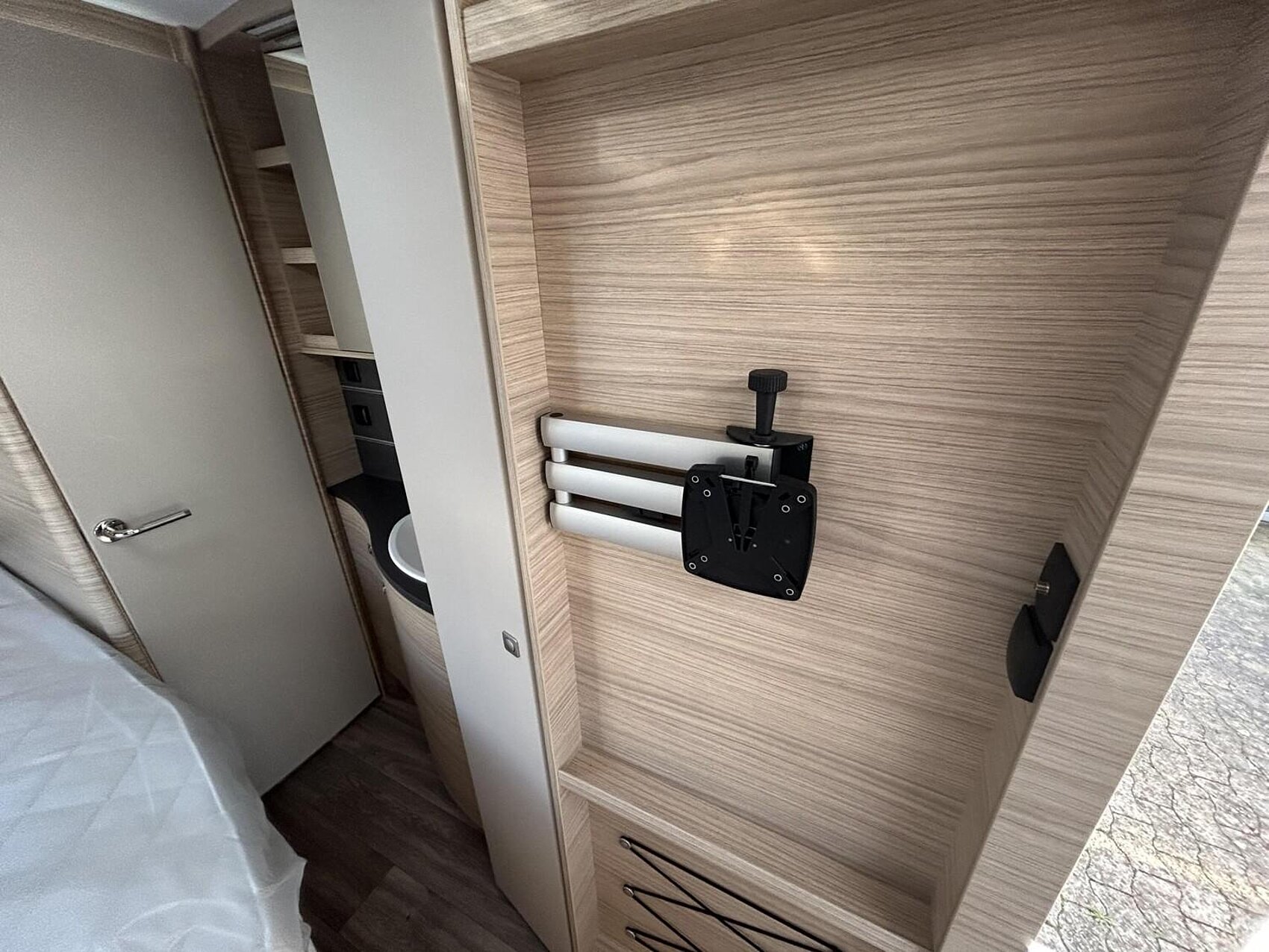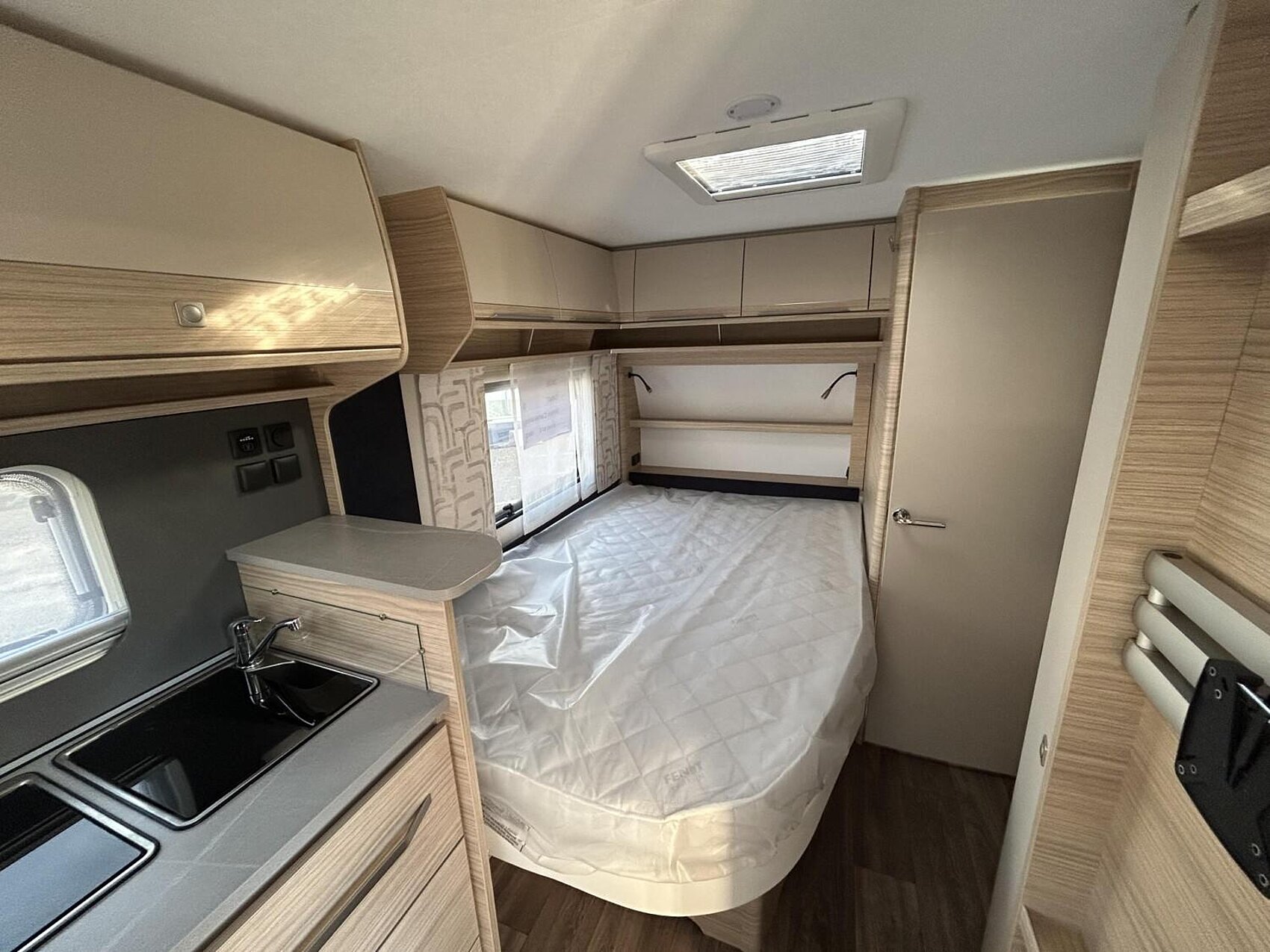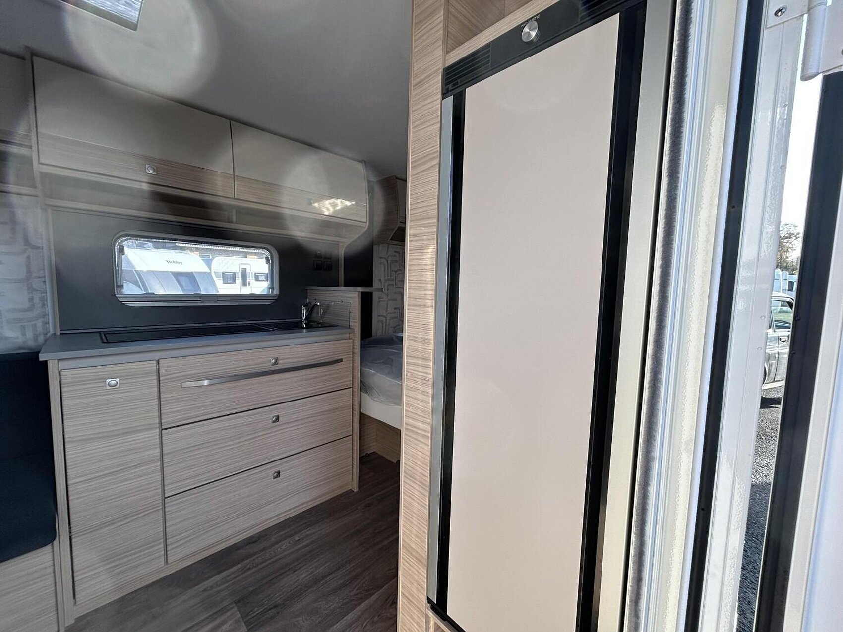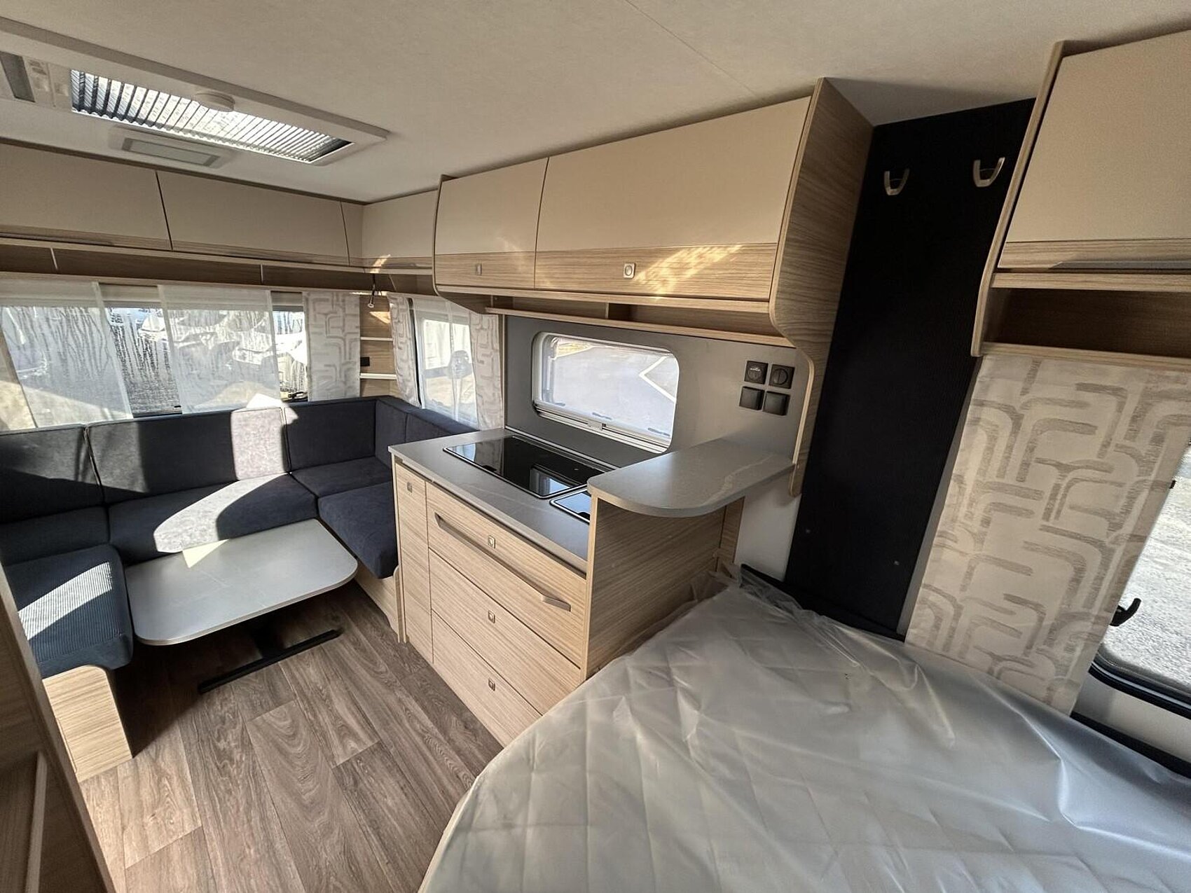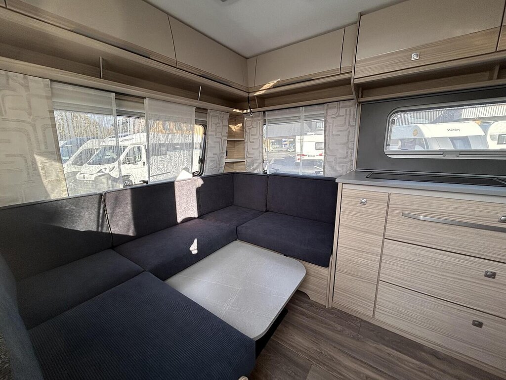 - Eingangstür mit integriertem und isoliertem Einstieg, Abfallsammler und Ablage, im oberen Eingangstürbereich getöntes Fenster und Verdunkelungsplissee