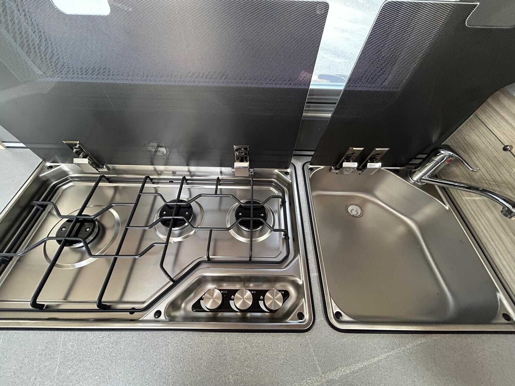 - Kocher (3-flammig) mit Zündsicherung, Zündautomatik, matt emailliertem Kocherrost, Glasabdeckung und separater Spüle mit Glasabdeckung