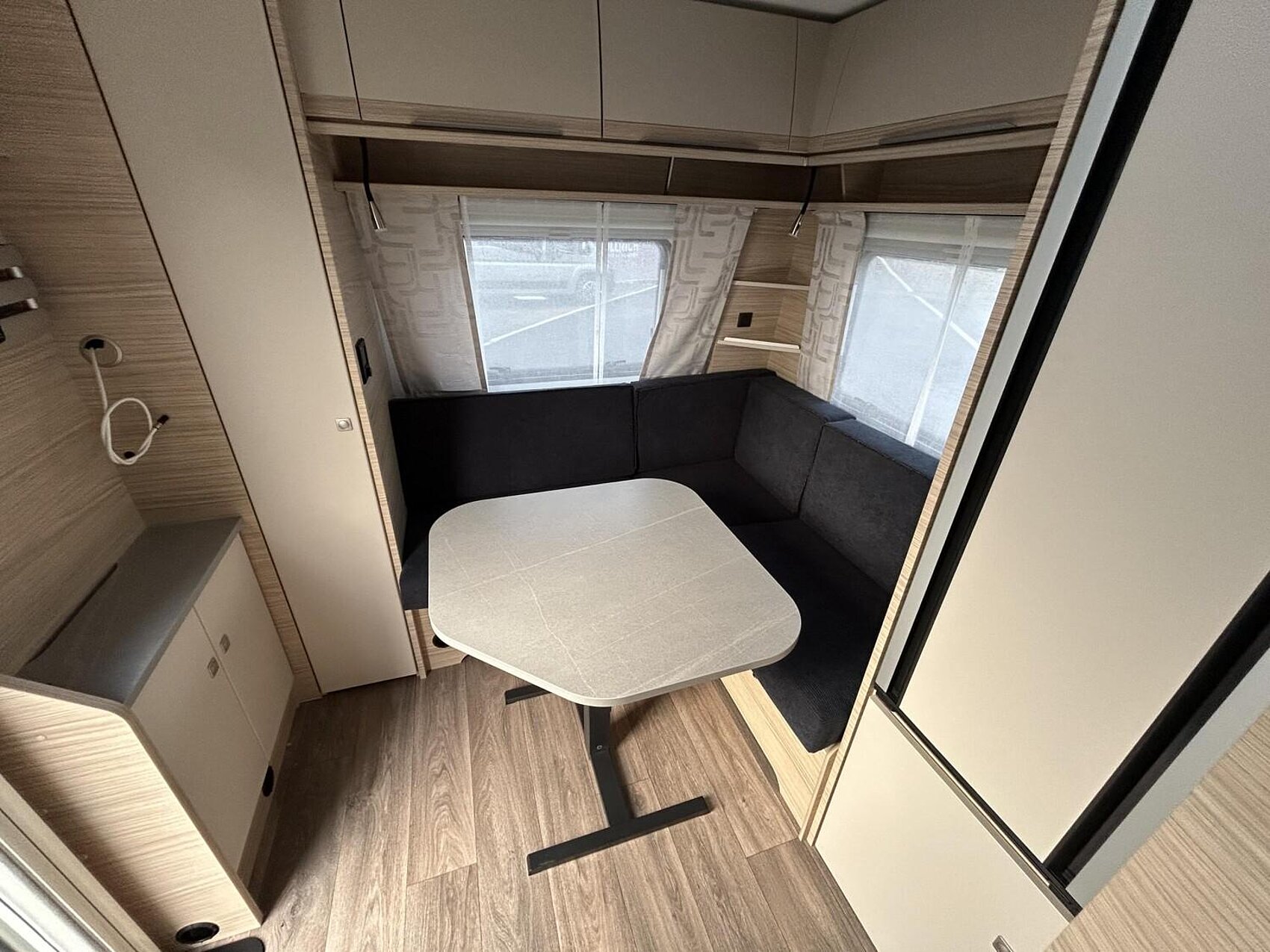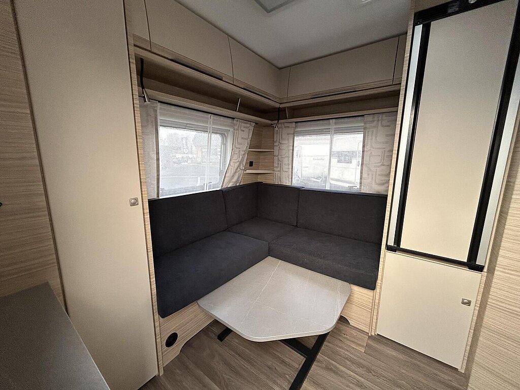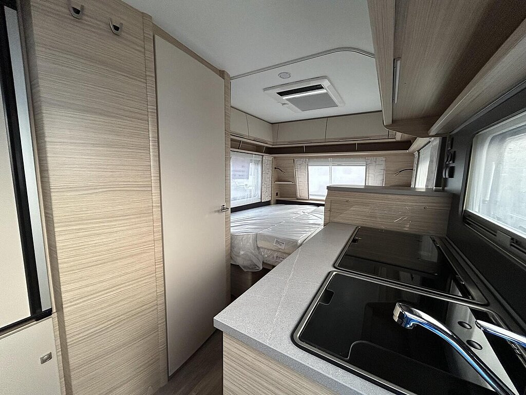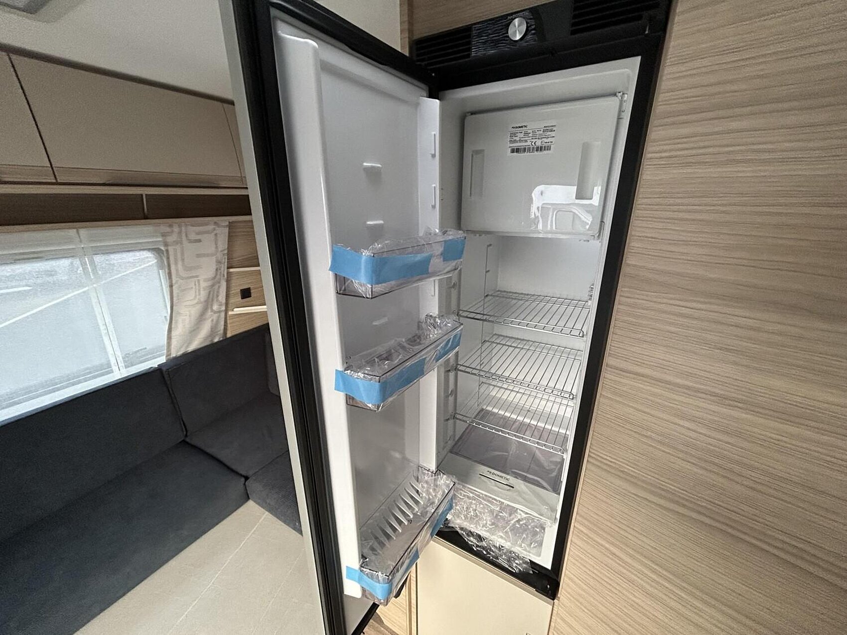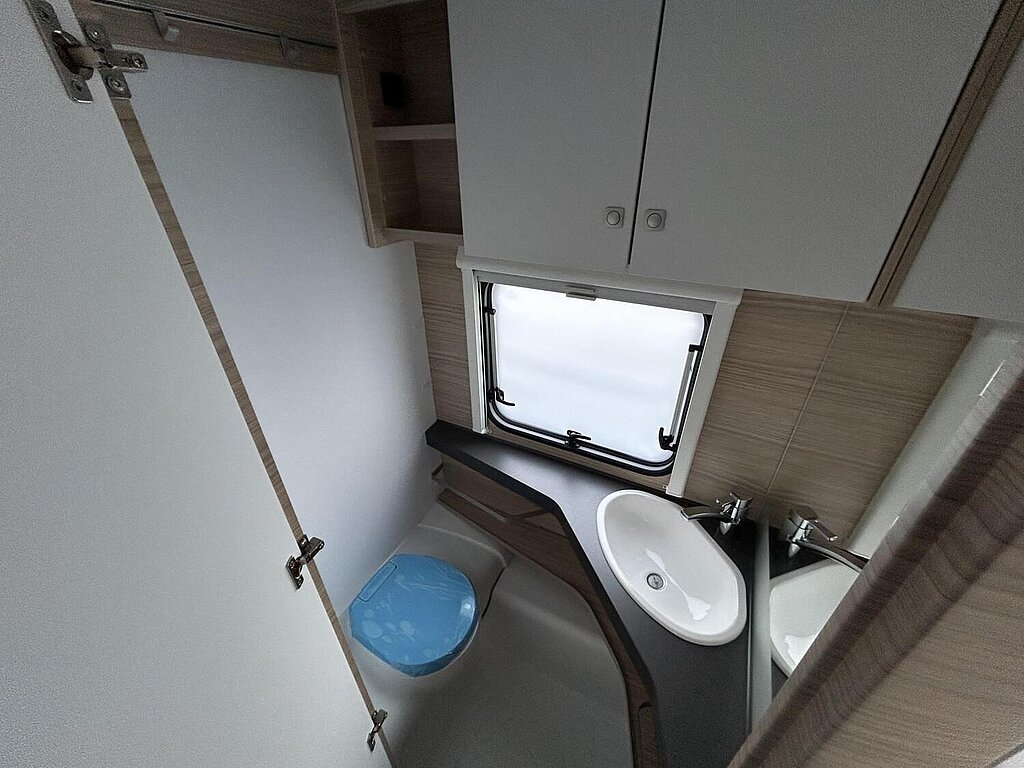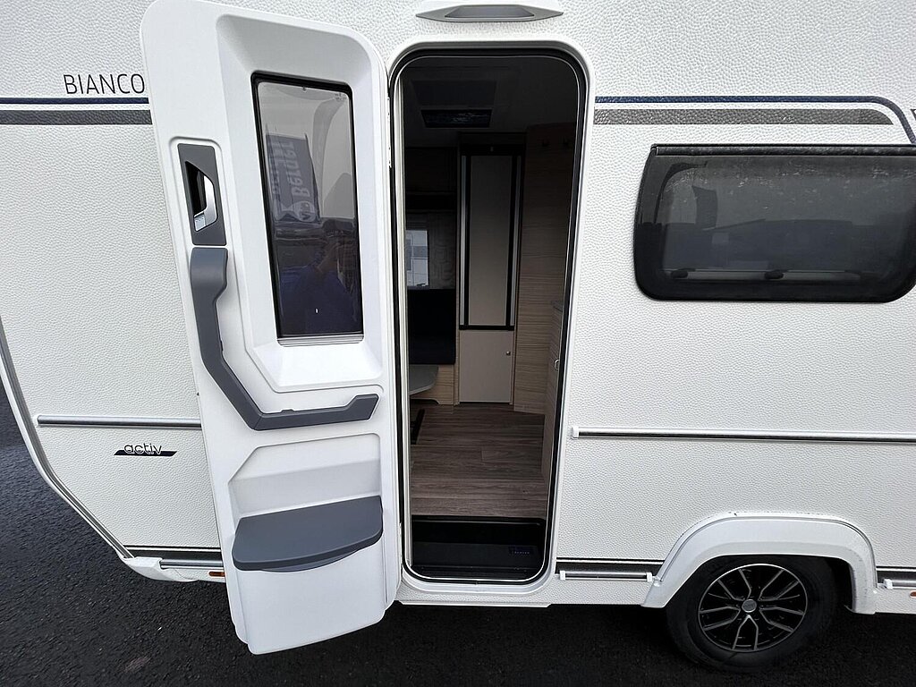 - Eingangstür mit integriertem und isoliertem Einstieg, Abfallsammler und Ablage, im oberen Eingangstürbereich getöntes Fenster und Verdunkelungsplissee