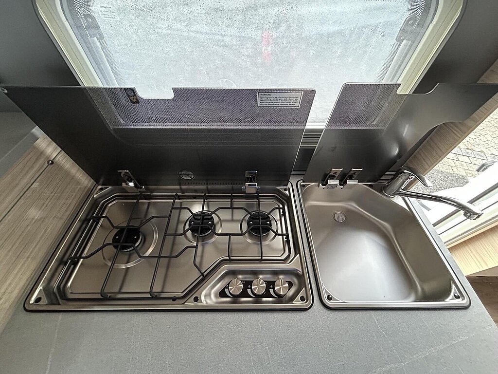 - Kocher (3-flammig) mit Zündsicherung, Zündautomatik, matt emailliertem Kocherrost, Glasabdeckung und separater Spüle mit Glasabdeckung