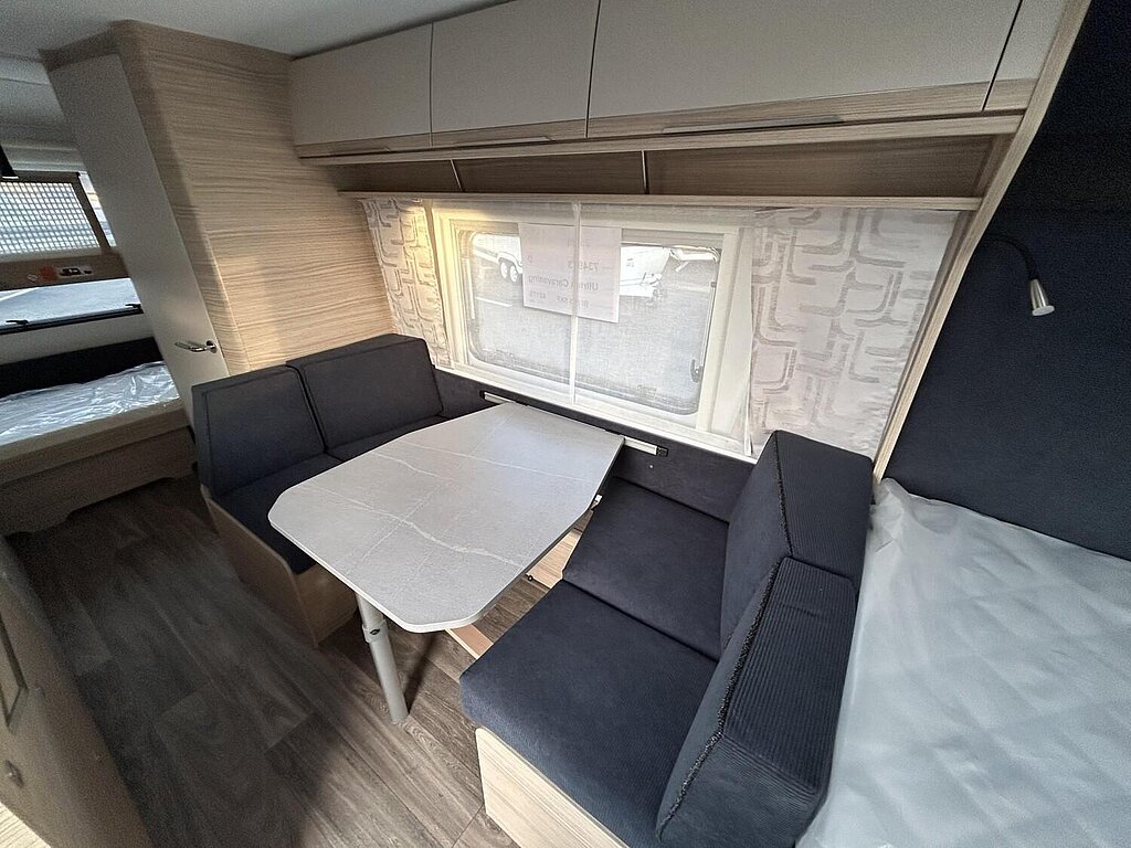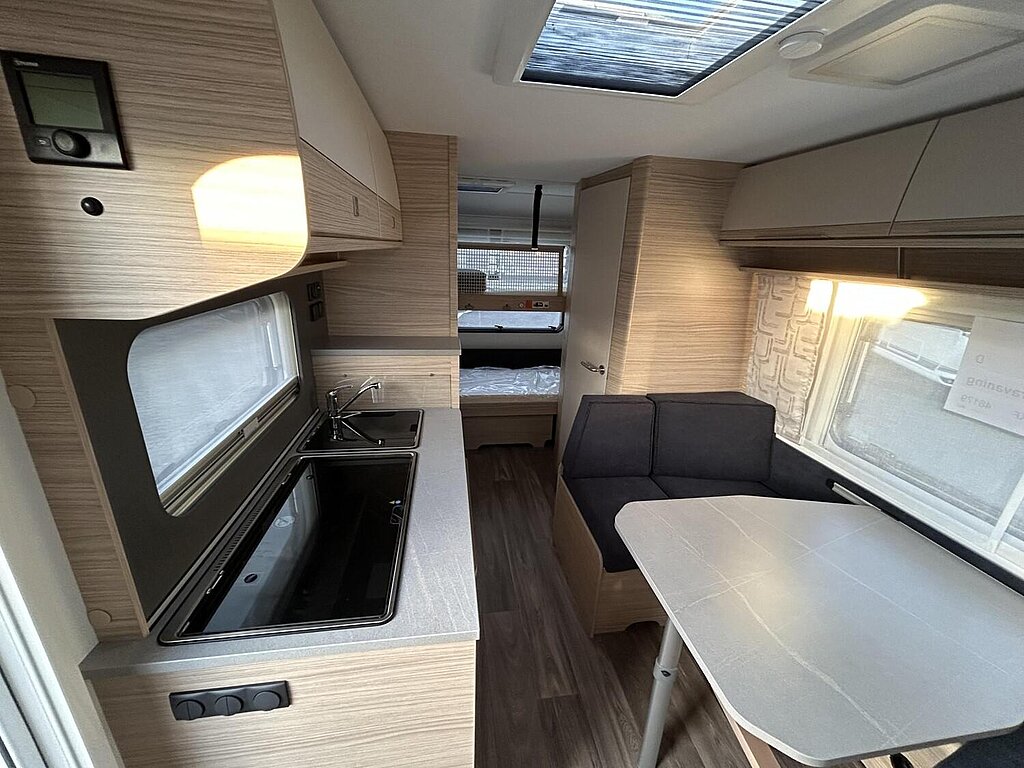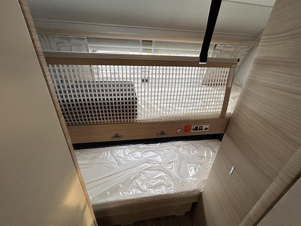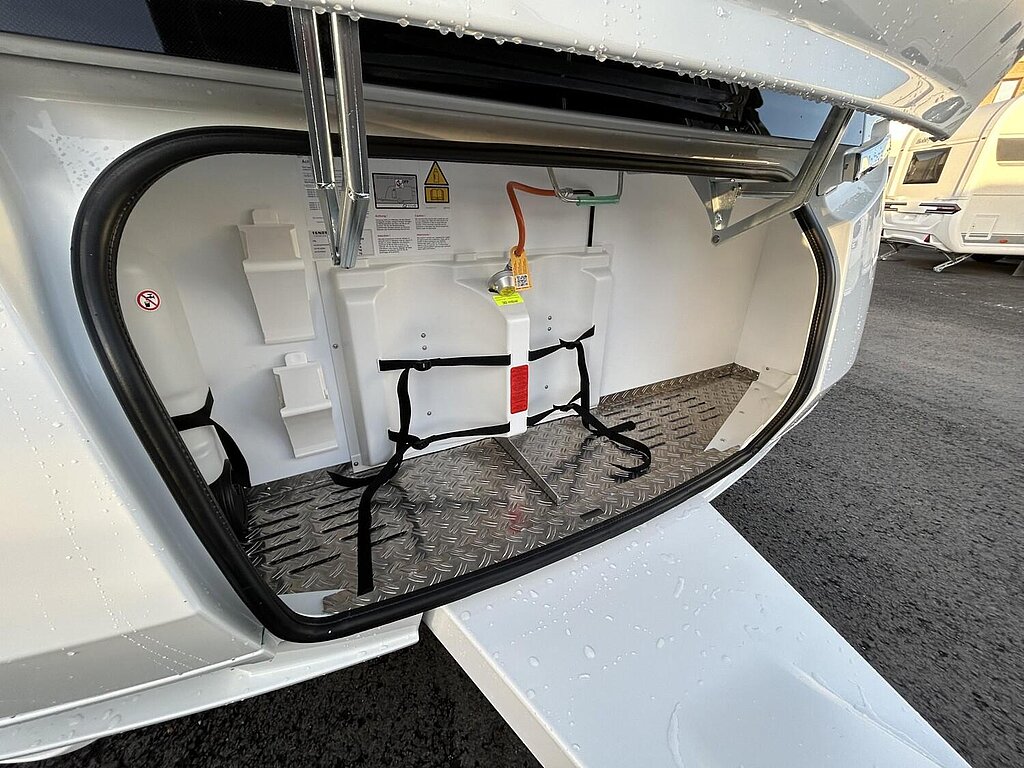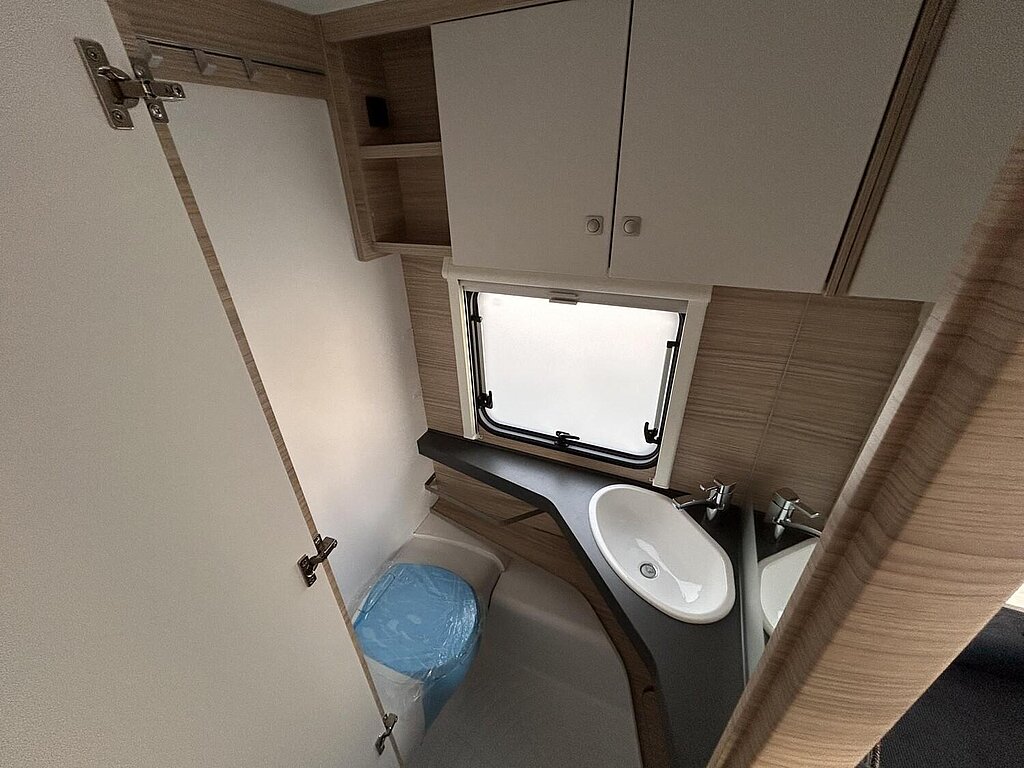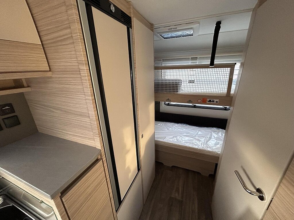 - Eingangstür mit integriertem und isoliertem Einstieg, Abfallsammler und Ablage, im oberen Eingangstürbereich getöntes Fenster und Verdunkelungsplissee