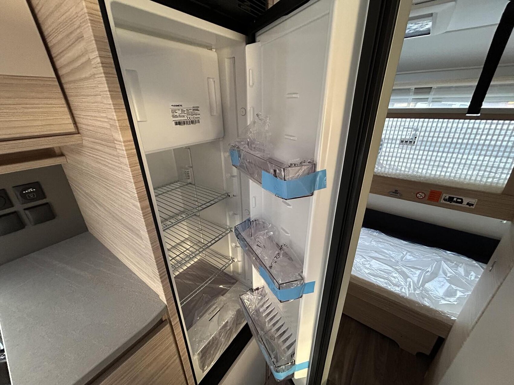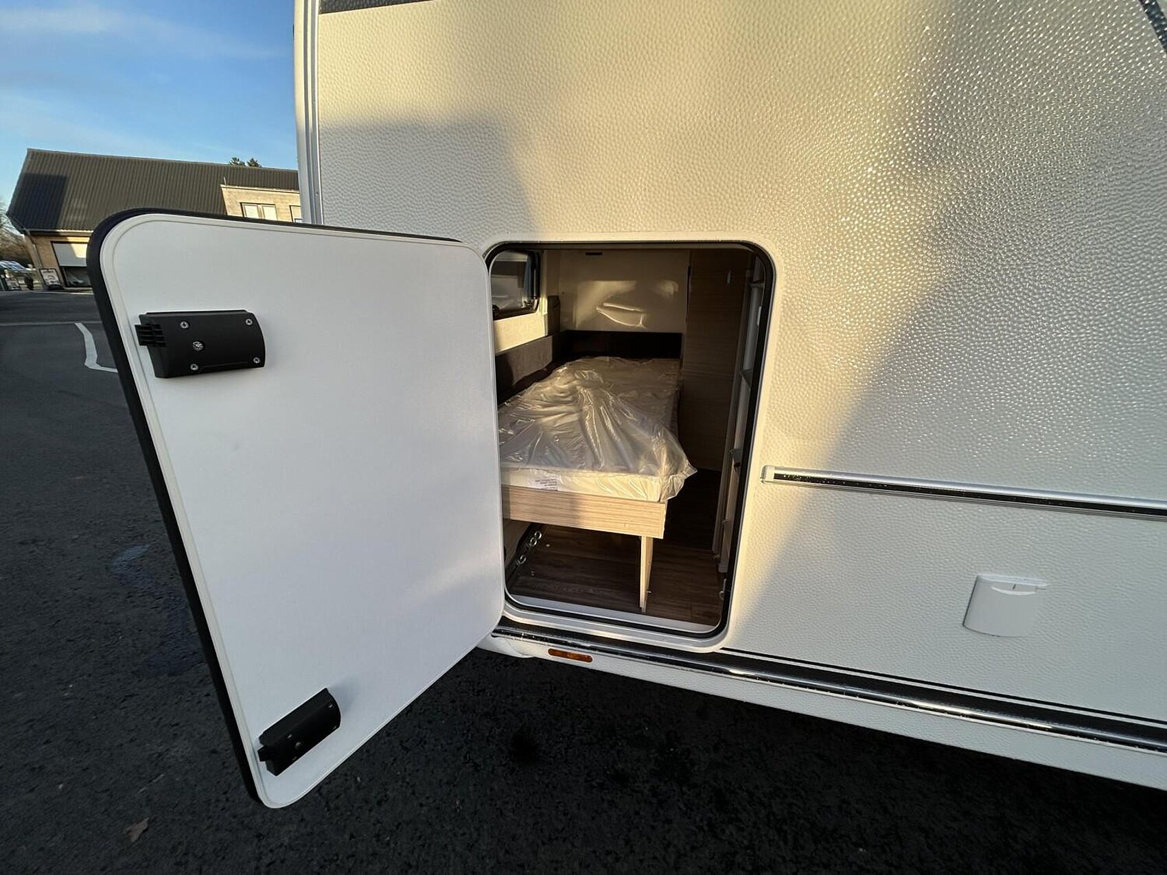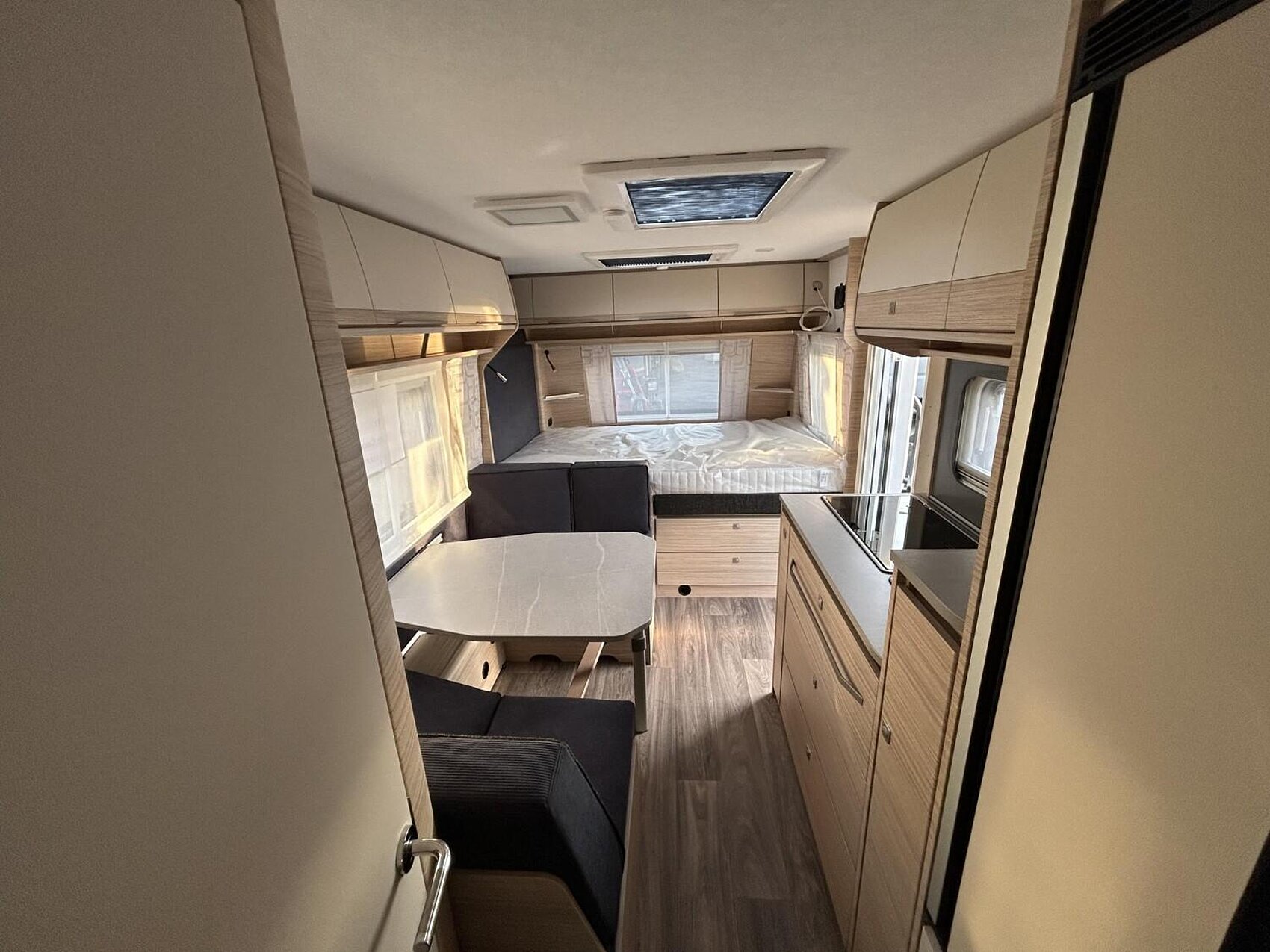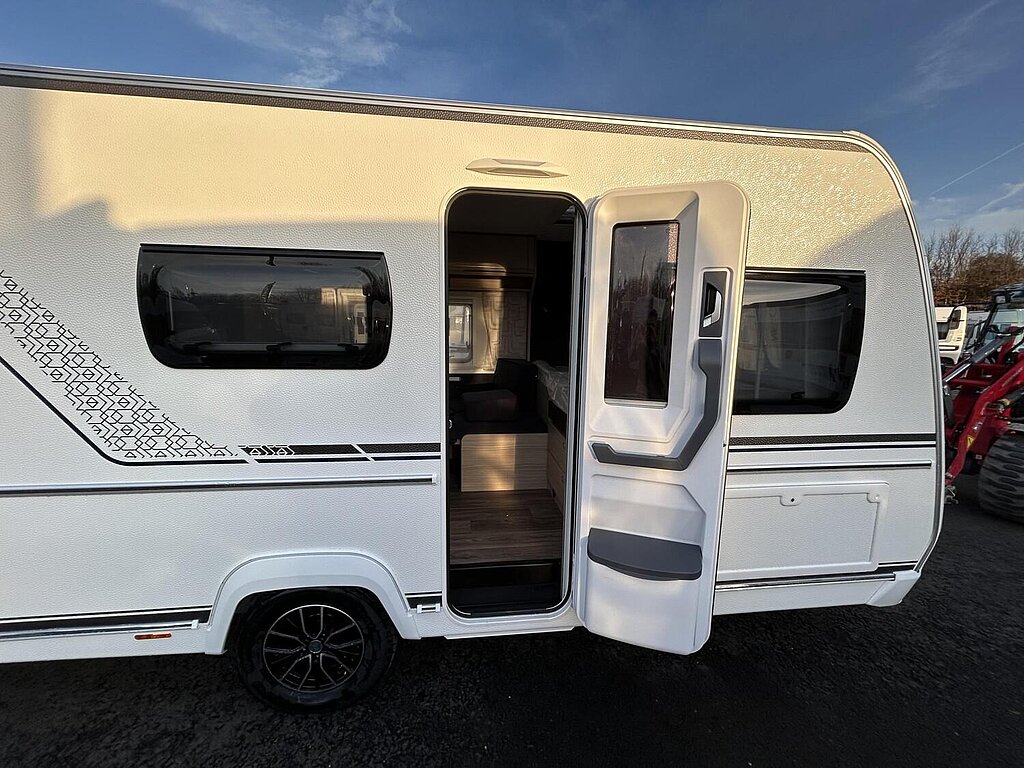 - Eingangstür mit integriertem und isoliertem Einstieg, Abfallsammler und Ablage, im oberen Eingangstürbereich getöntes Fenster und Verdunkelungsplissee