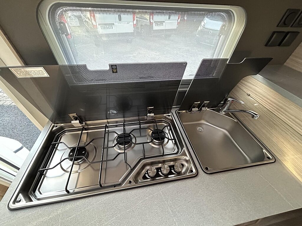 - Kocher (3-flammig) mit Zündsicherung, Zündautomatik, matt emailliertem Kocherrost, Glasabdeckung und separater Spüle mit Glasabdeckung