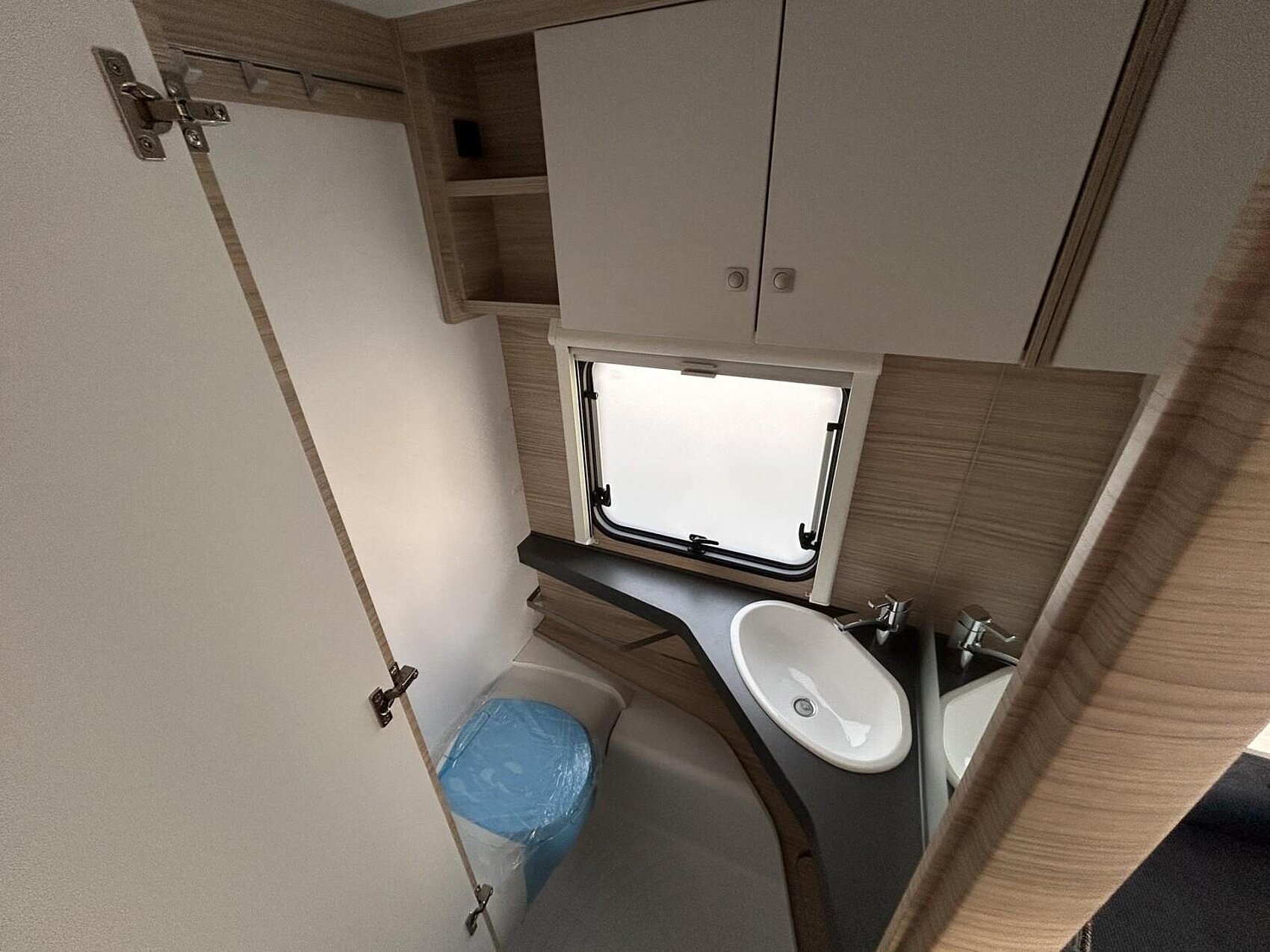 - Ausstellfenster doppelt verglast, getönt, mit Einhandbedienung und kombiniertem Fliegenschutz-/Verdunkelungsrollo