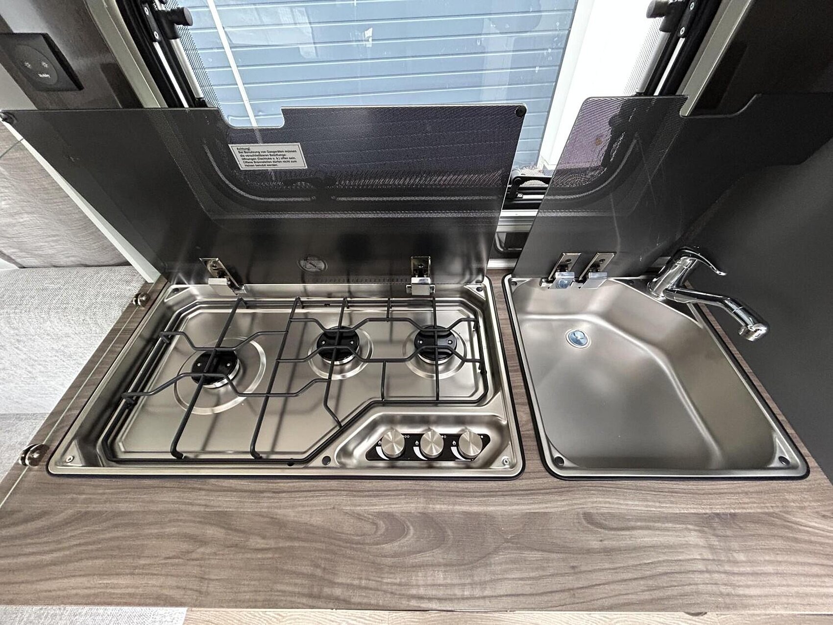 Besteckeinsatz, Handtuchhalter, Küchenrückwand mit integriertem Verdunkelungs- und Insektenschutzrollo