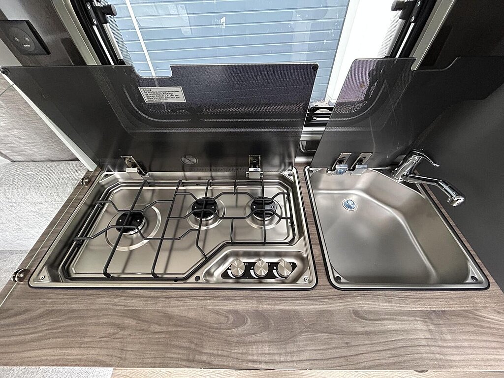 3-Flammkocher und Spüle aus Edelstahl, elektrische Zündung, zweiteilige Glasabdeckung