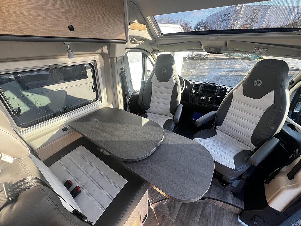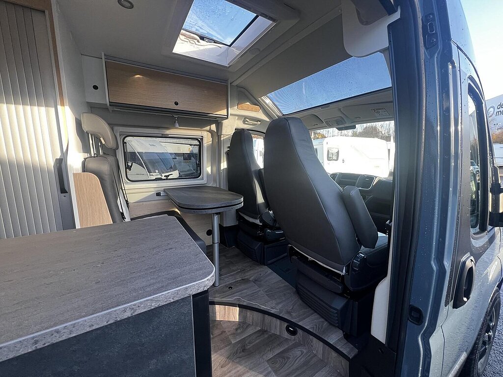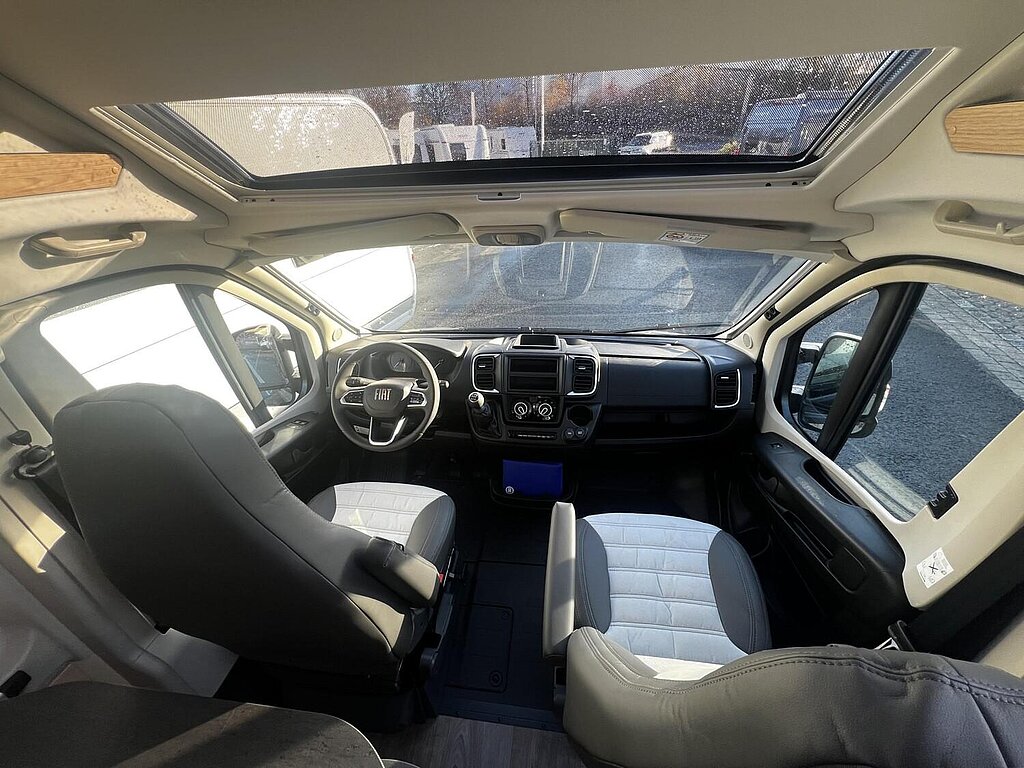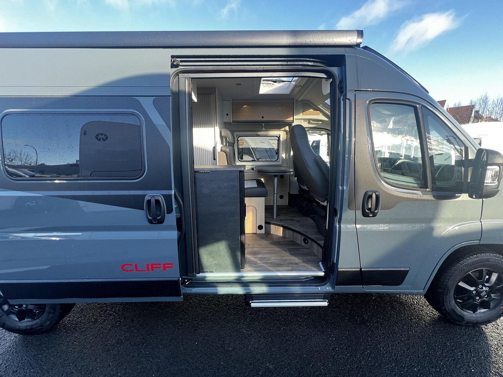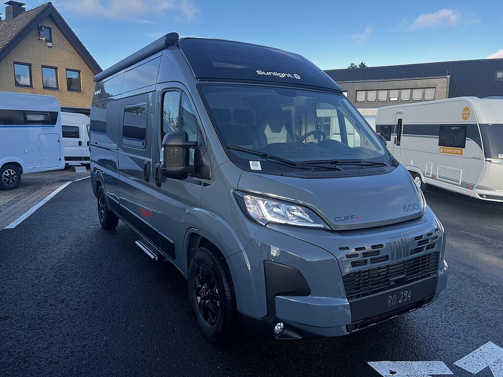 Cliff X Ausstattung 600 (Fiat Ducato 3.500 kg | 2.2 | 103 kW | 140 PS Euro 6 | 6-Gang-Schaltgetriebe, Fiat Weiß, Adventure Beklebung, Wohnwelt Adventure, LED Beleuchtung Dachschrank, Dachstauschrank Heck umlaufend, Skyview, Rahmenfenster, Variobad, Markise (schwarz), Panoramadachhaube 70 x 50 cm, Duschausstattung, Fenster im Bad, Kleiderstange in der Nasszelle, Breite Einstiegsstufe, Drehplatte für Tischerweiterung an der Sitzgruppe, Stoßfänger lackiert, Skid Plate Schwarz, Nebelscheinwerfer, Lenkrad & Schaltknauf in Lederausführung, Luftauslässe mit Applikationen Silber (Techno-Trim), 16" Alufelgen Bi-Color)