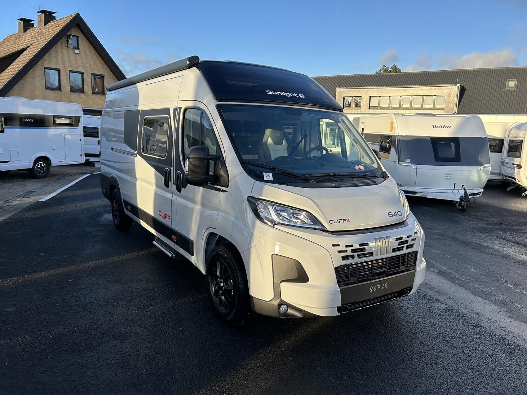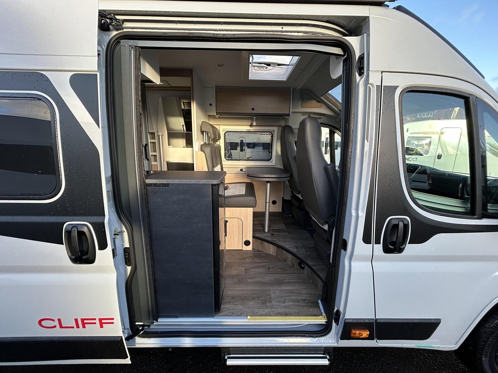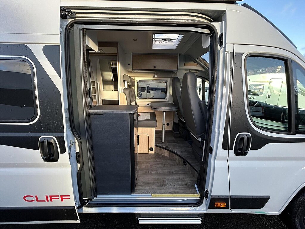 Cliff X Ausstattung 640 (Fiat Ducato 3.500 kg | 2.2 | 103 kW | 140 PS Euro 6 | 6-Gang-Schaltgetriebe, Fiat Weiß, Adventure Beklebung, Wohnwelt Adventure, LED Beleuchtung Dachschrank, Dachstauschrank Heck umlaufend, Skyview, Rahmenfenster, Variobad, Markise (schwarz), Panoramadachhaube 70 x 50 cm, Duschausstattung, Fenster im Bad, Kleiderstange in der Nasszelle, Breite Einstiegsstufe, Drehplatte für Tischerweiterung an der Sitzgruppe, Stoßfänger lackiert, Skid Plate Schwarz, Nebelscheinwerfer, Lenkrad & Schaltknauf in Lederausführung, Luftauslässe mit Applikationen Silber (Techno-Trim), 16" Alufelgen Bi-Color)